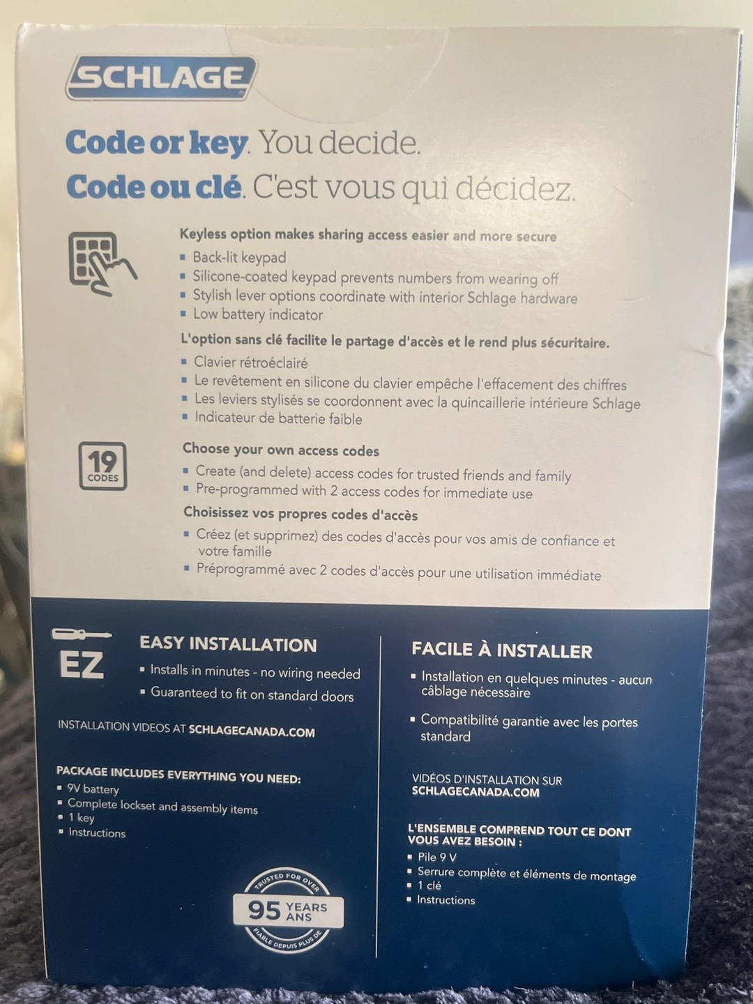 This package is brand new never opened and is a dream to operate when you never have to fumble and search for keys. This lock set is programmable to your unique 4 digit passcode.