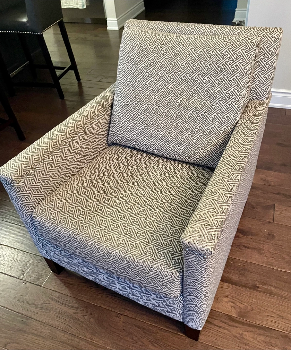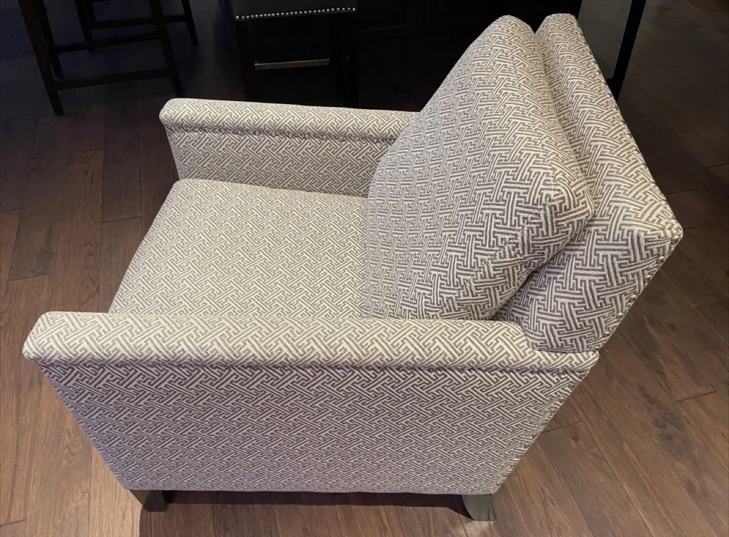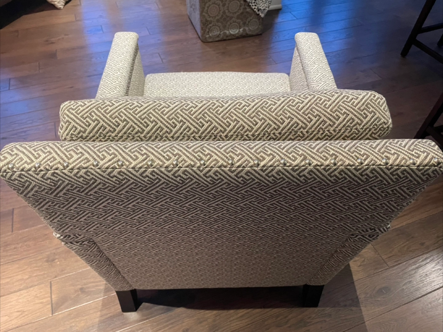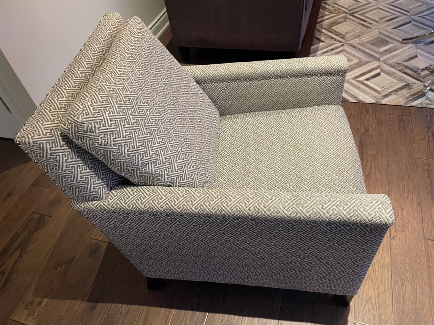 Elegant armchair. Features an upholstered pattern. Includes a matching cushion. Perfect for a cozy reading nook.