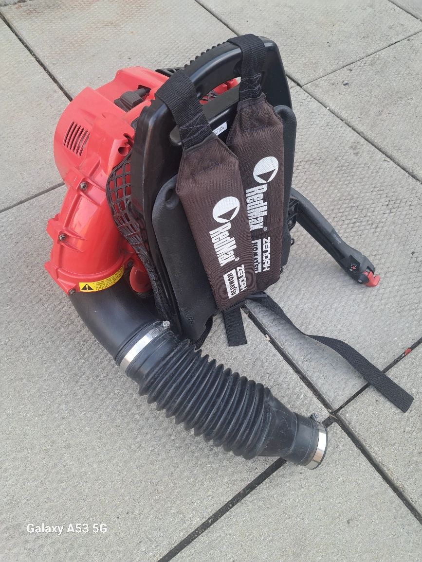 Leaf blower with a red and black exterior. Appears to have a backpack design. A great tool to use for maintaining a peaceful outdoor space. missing attachment. other then that it starts and runs great