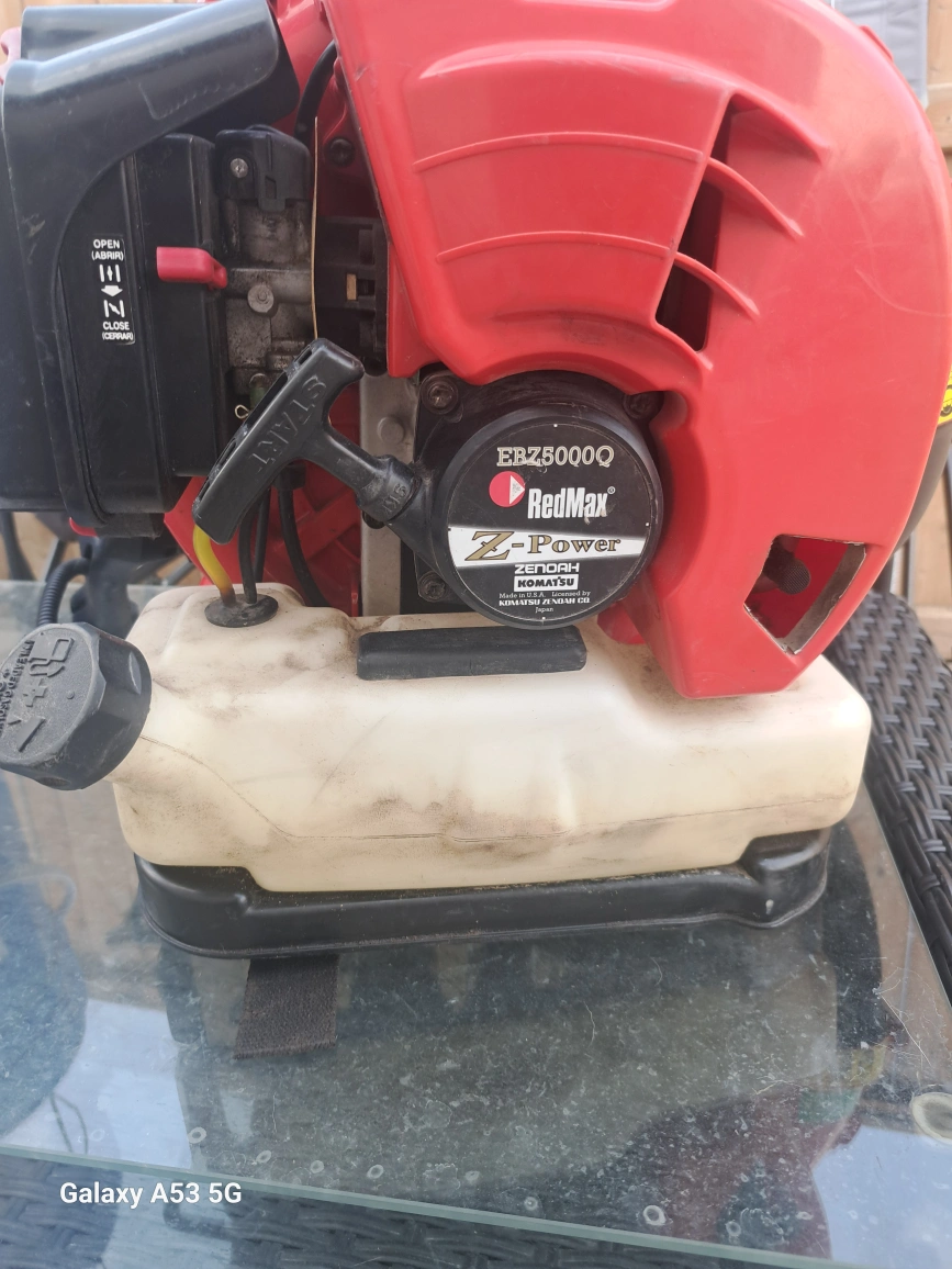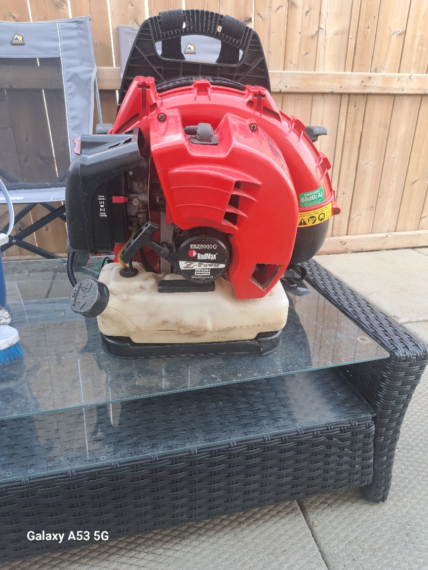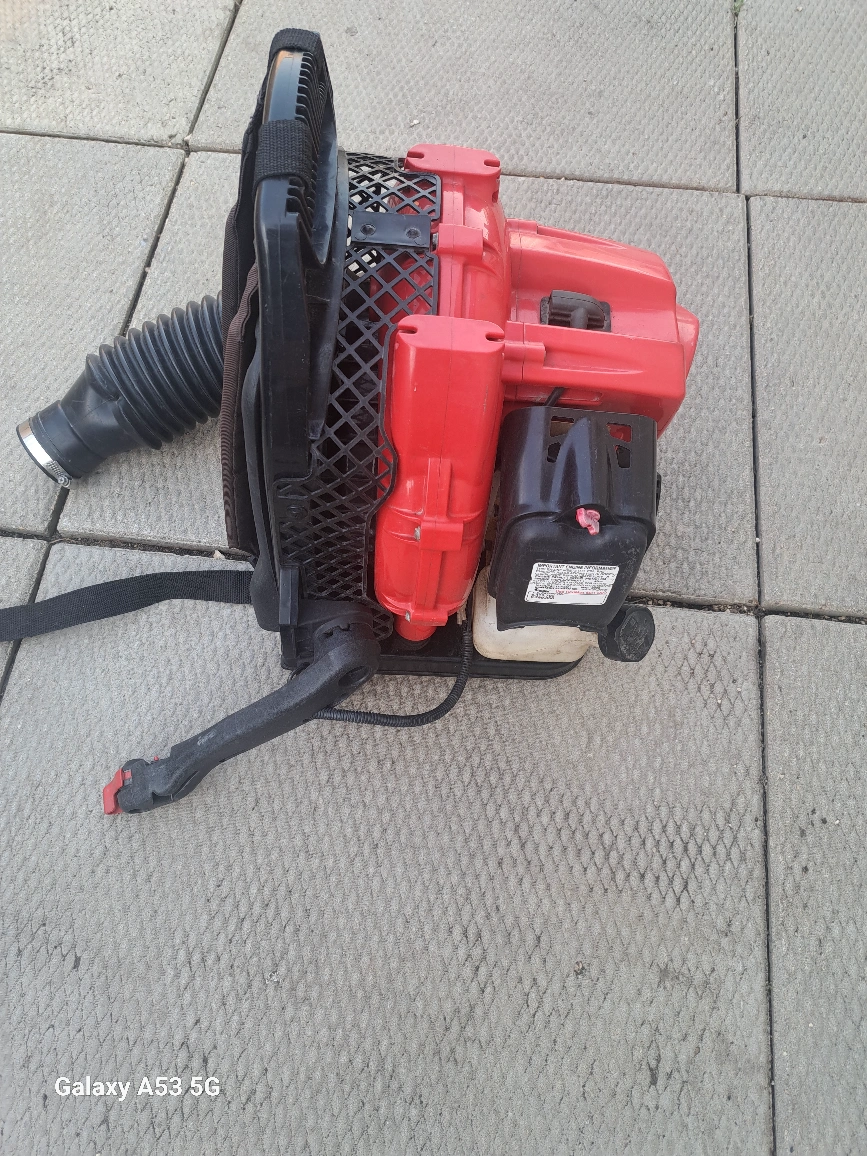 Leaf blower with a red and black exterior. Appears to have a backpack design. A great tool to use for maintaining a peaceful outdoor space. missing attachment. other then that it starts and runs great