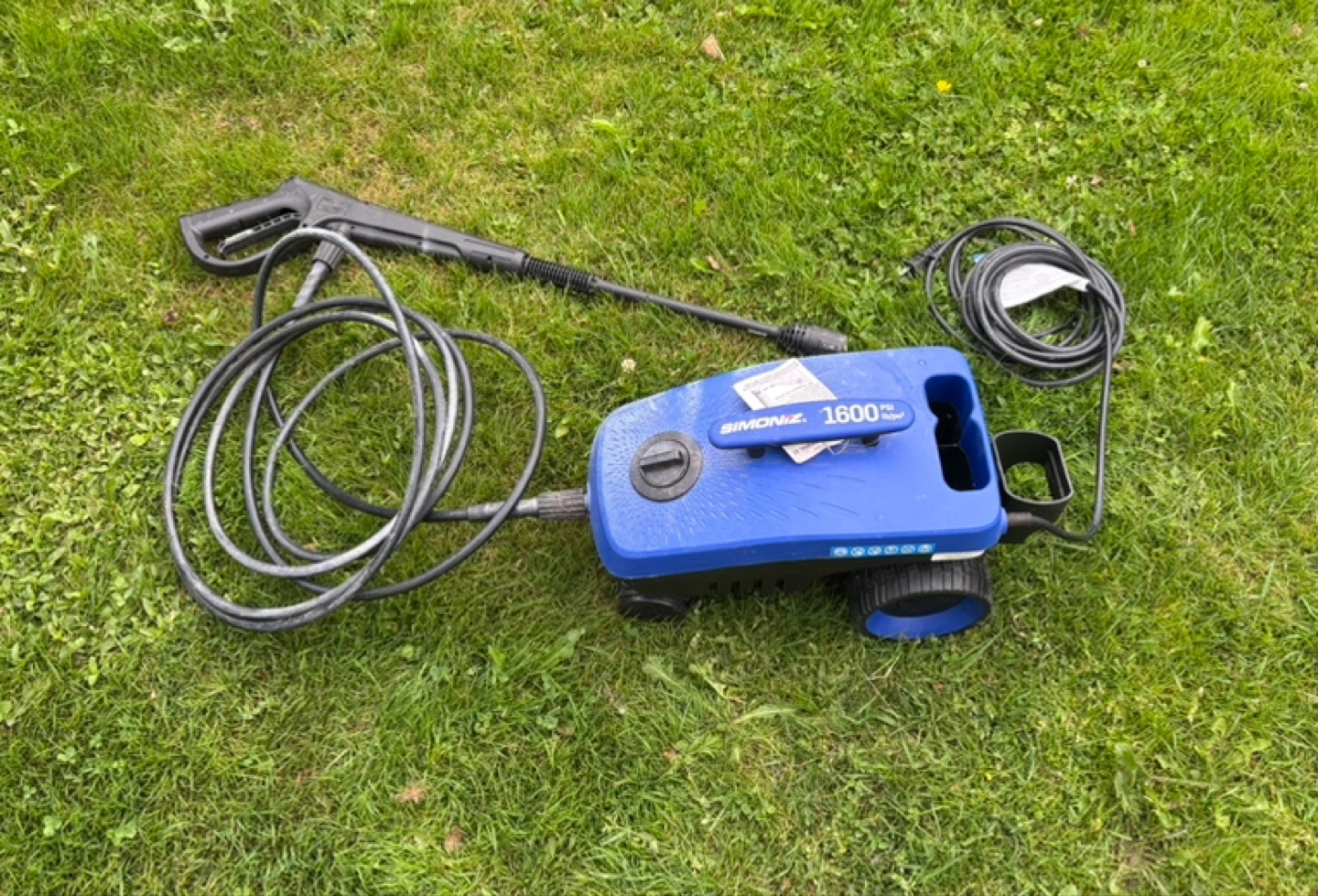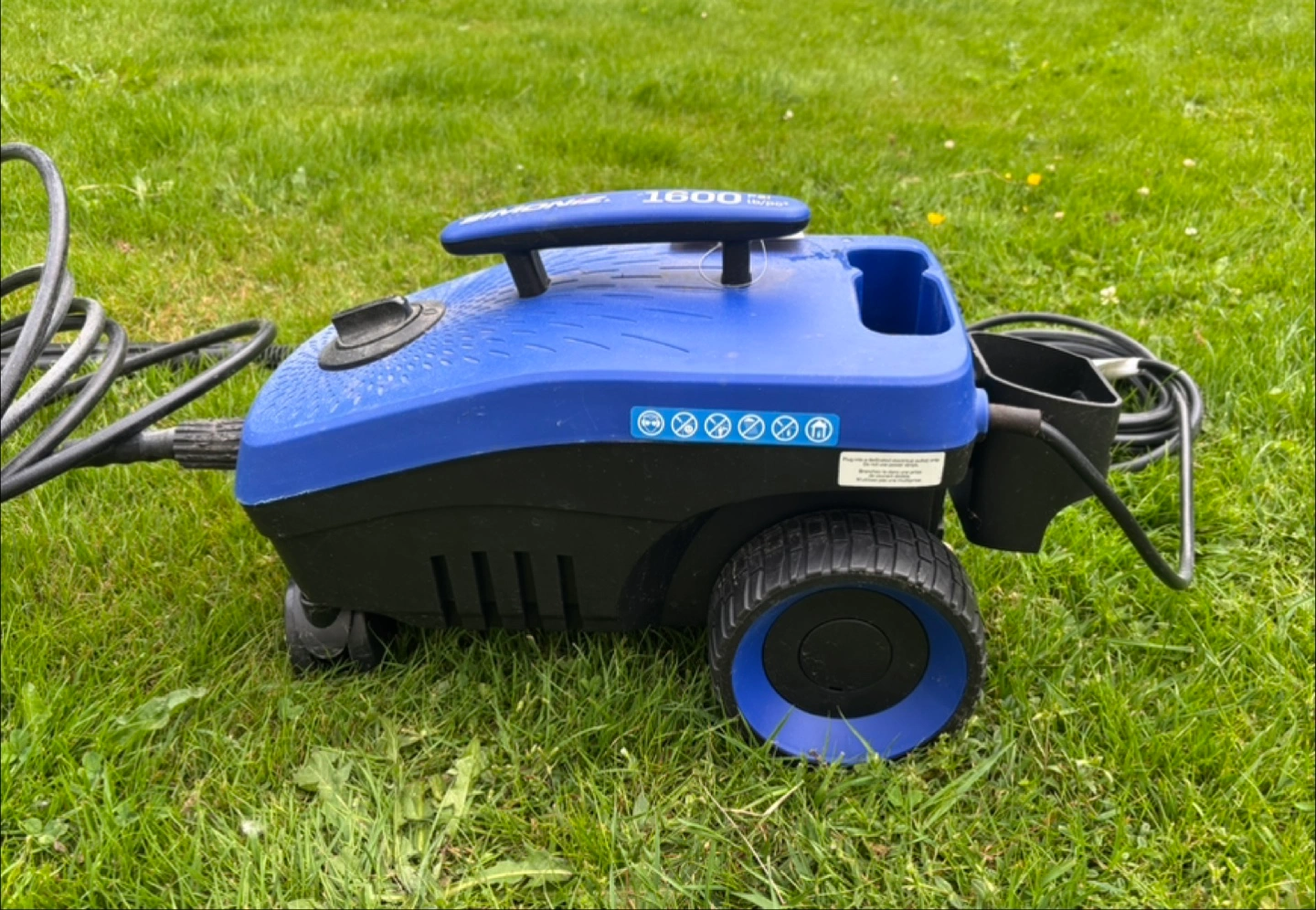 A 1600 PSI pressure washer. Featuring wheels for easy mobility. Includes a wand with 3 adjustable nozzle settings.
