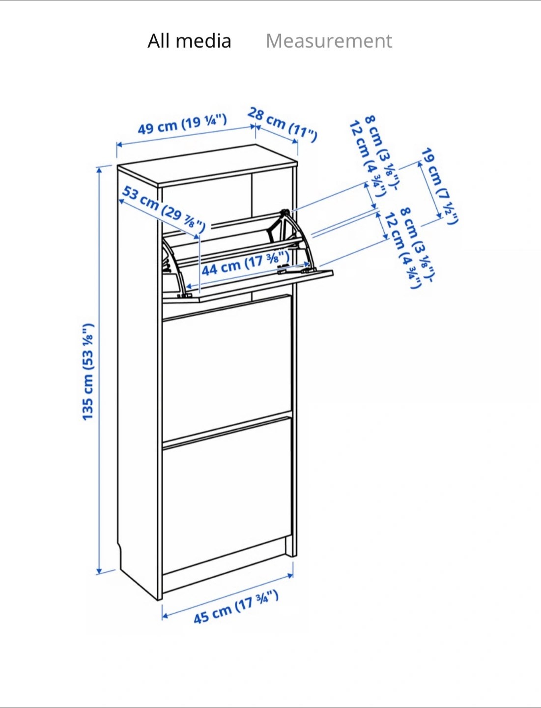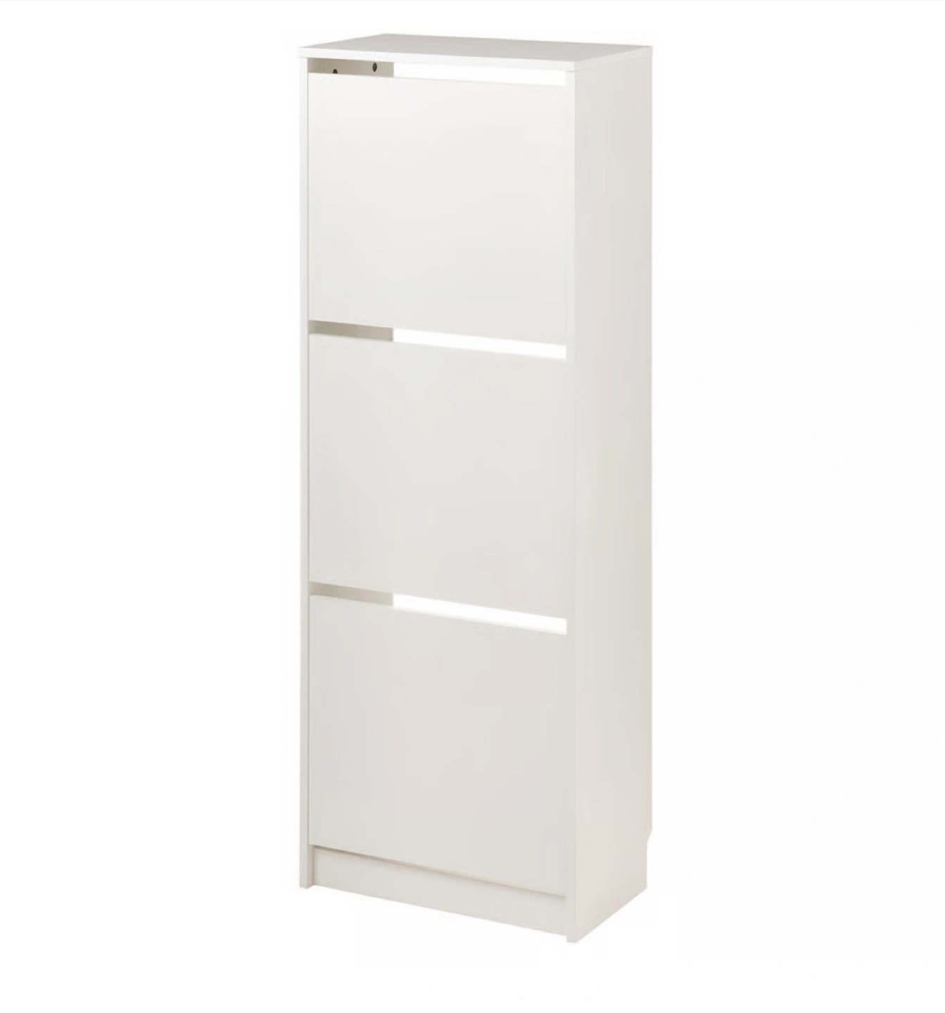 A tall white shoe cabinet. Features three tilting shoe compartments. Offers a clean, organized space. You can easily tidy up your shoes with this cabinet.