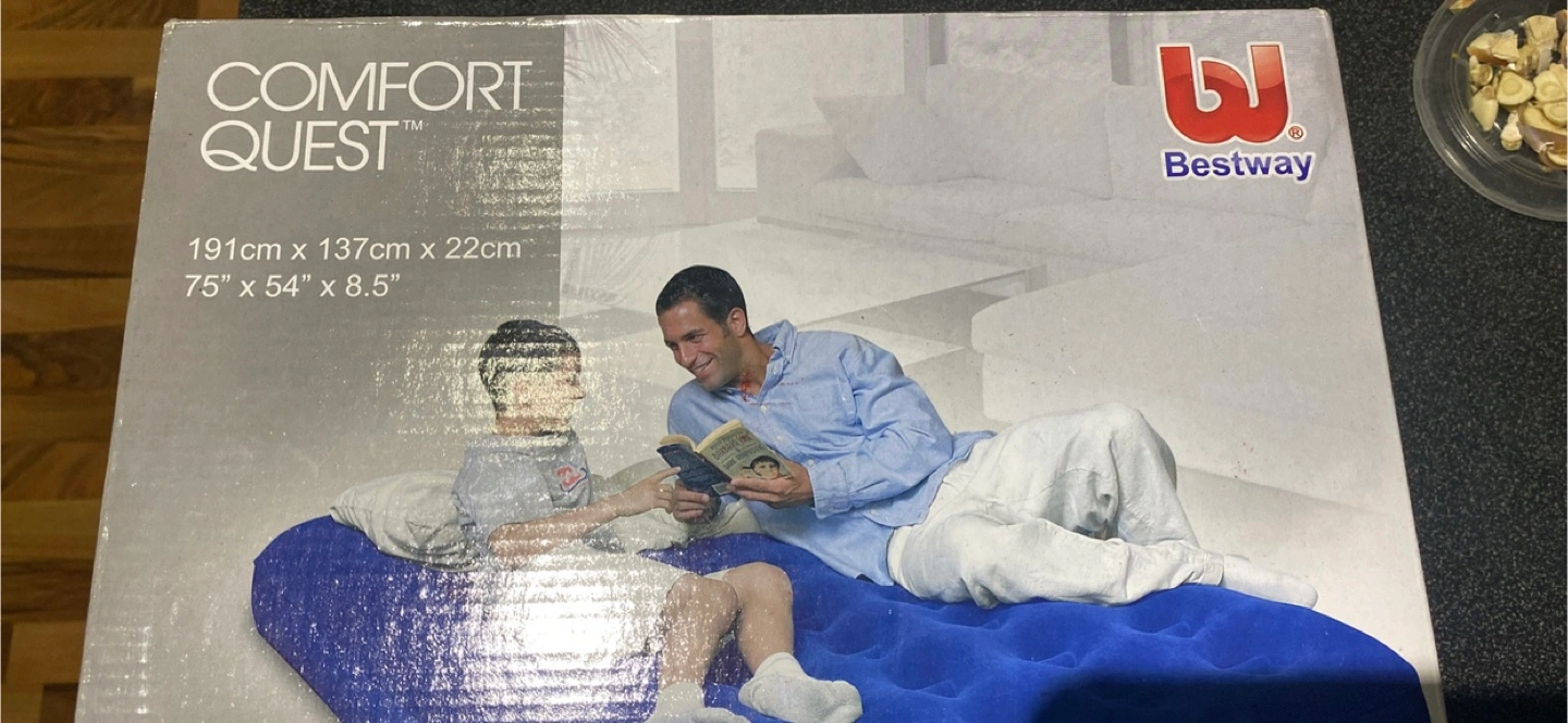 A blue, inflatable air mattress. Comes in original box. A great option for a comfortable night's sleep for unexpected guests.