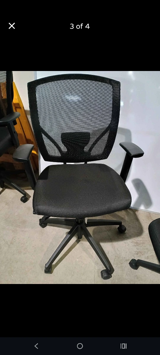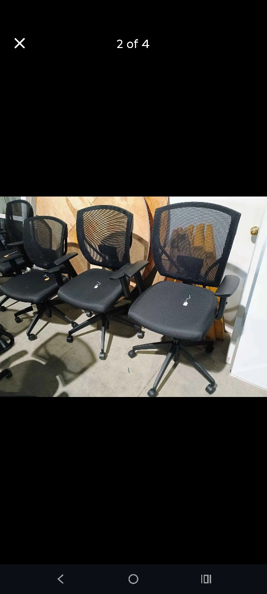 60Black mesh back rolling office chair with arms. Padded cloth seat. Height adjustable. Swivel. In great condition. Approx 4-5 years old. Qty 30. $145 each plus HST. Pick up near Conestoga Mall in Waterloo Monday-Friday from 12-5 p.m., by appointment.