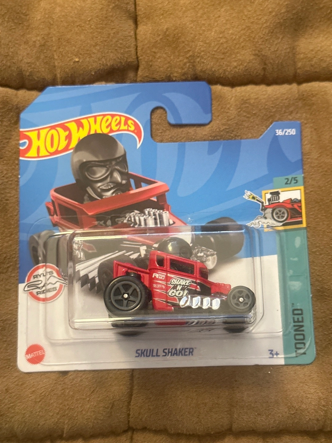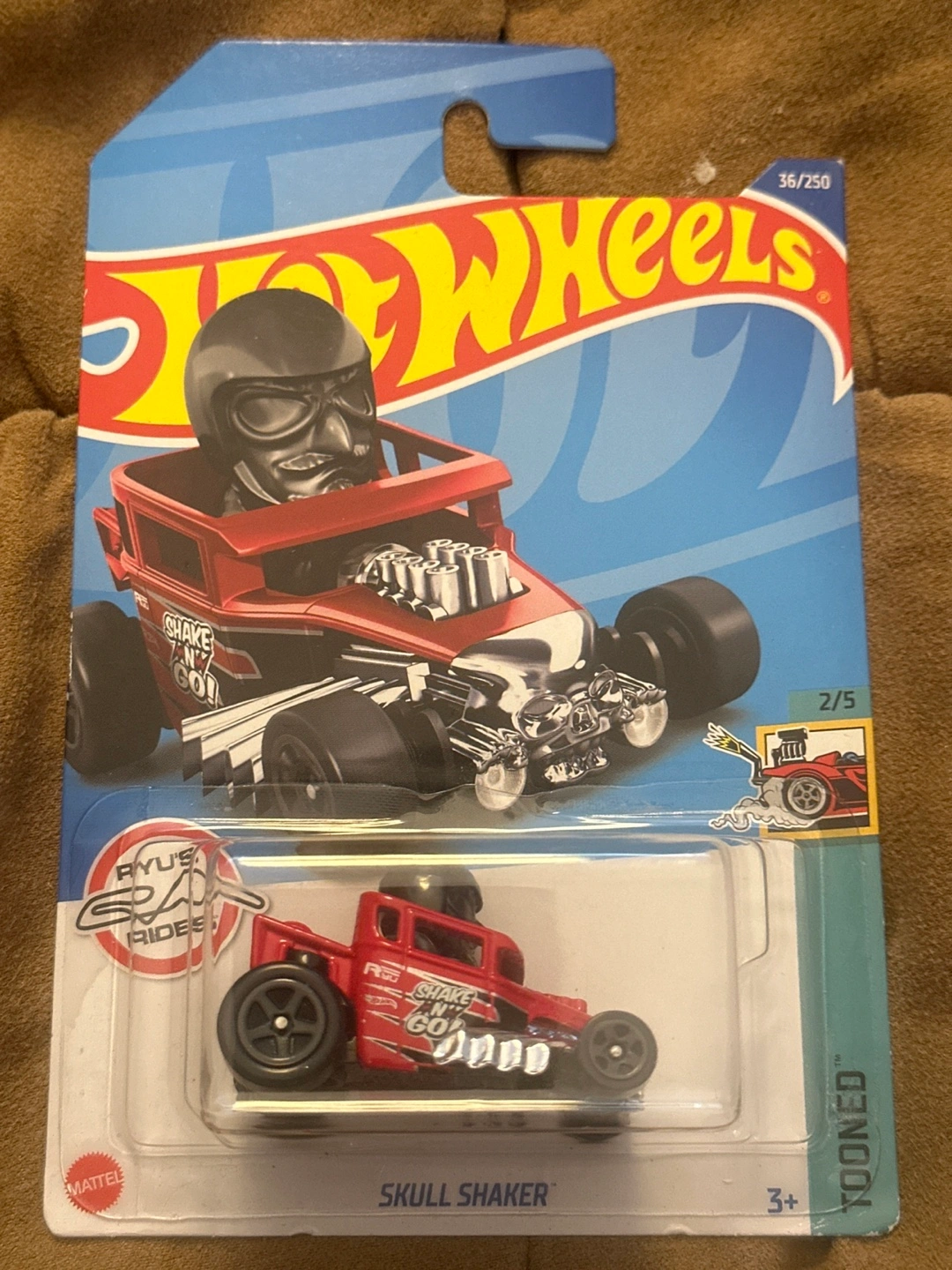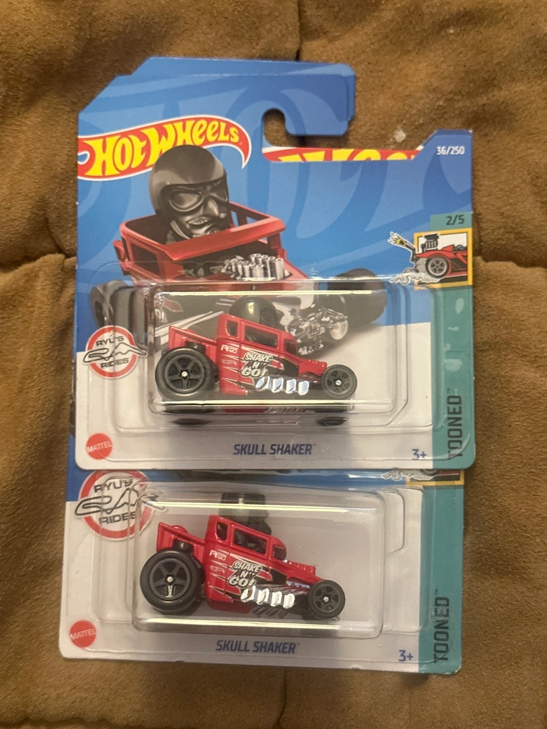 249Two matching toy cars. Features a red body, black wheels, and a helmeted figure. One tall card and one short card, RYU’s picks collection.