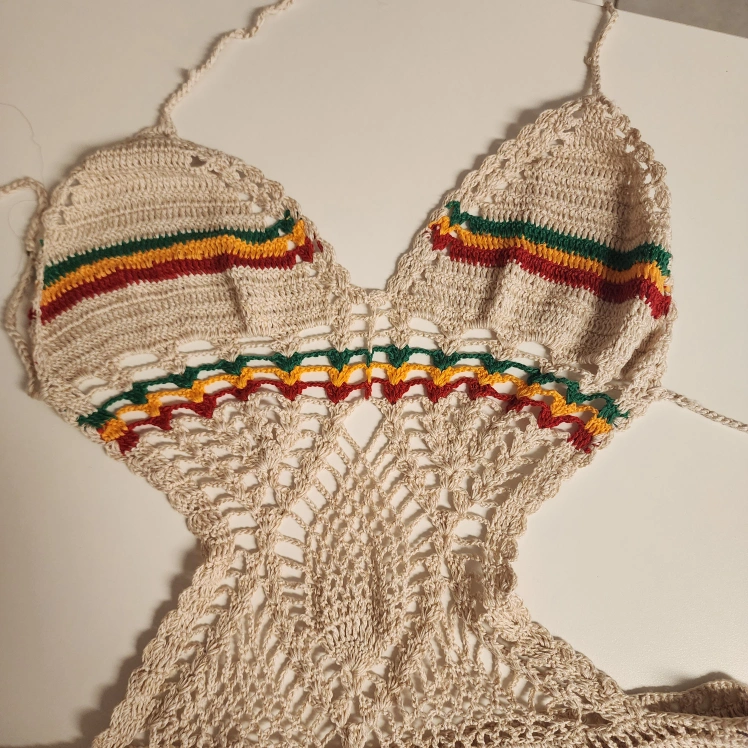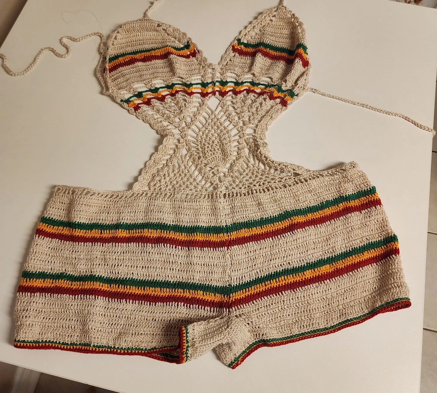 864Bought in Jamaica. Beige crochet romper. Features red, green, and yellow stripes. Made by hand. Perfect for relaxing on a warm summers day or festival.