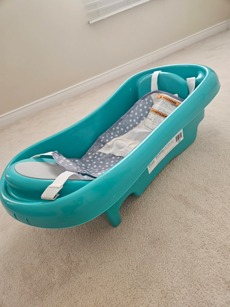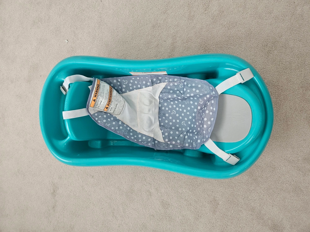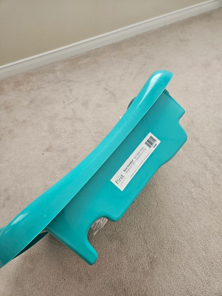 A vibrant turquoise bathtub. Comes with a removable sling. Has a non-slip surface. It would be the perfect way to give your baby a relaxing bath.