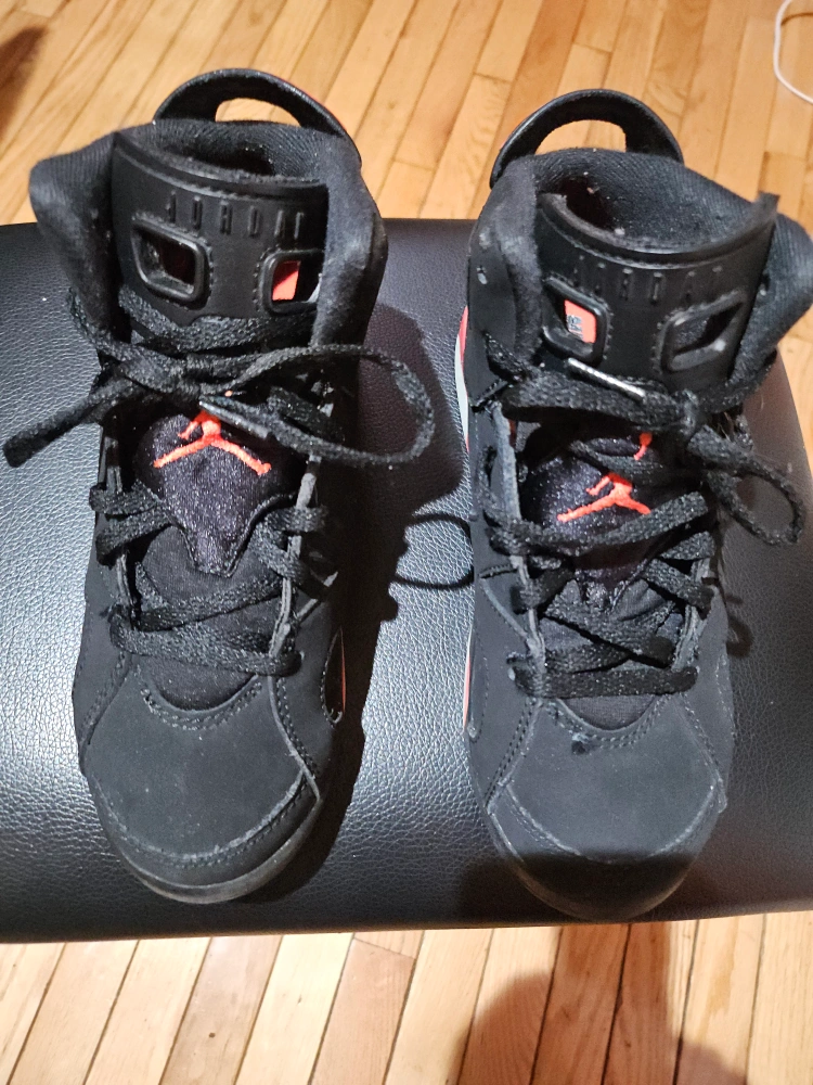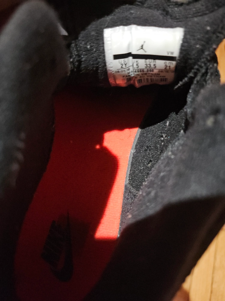 A pair of Jordan sneakers. The sneakers have black laces. They have red accents. These sneakers are great for making memories.