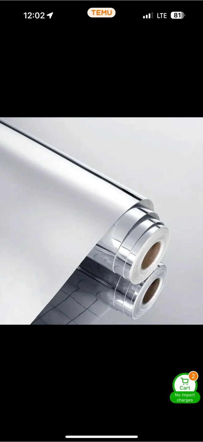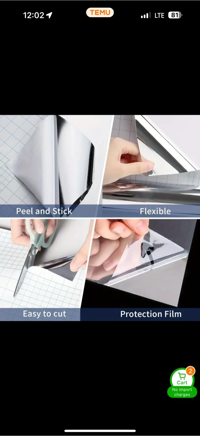 Silver mirror film. Easy to cut and flexible. Great for small projects around the house.