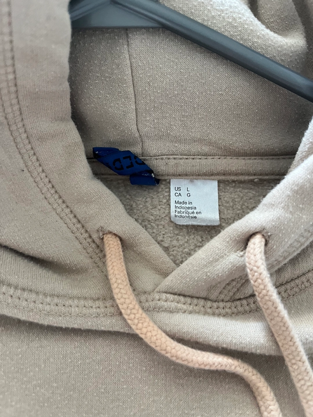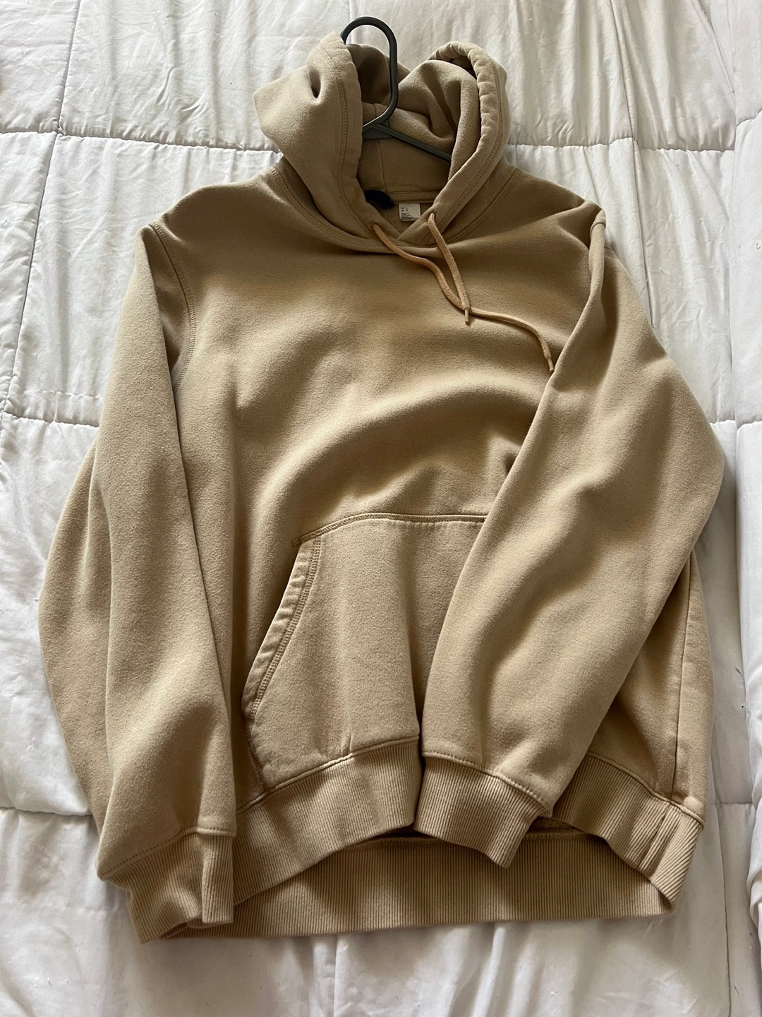 Beige hoodie. Features a hood with drawstrings and a large front pocket. Offers long sleeves and a ribbed hem and cuffs.
