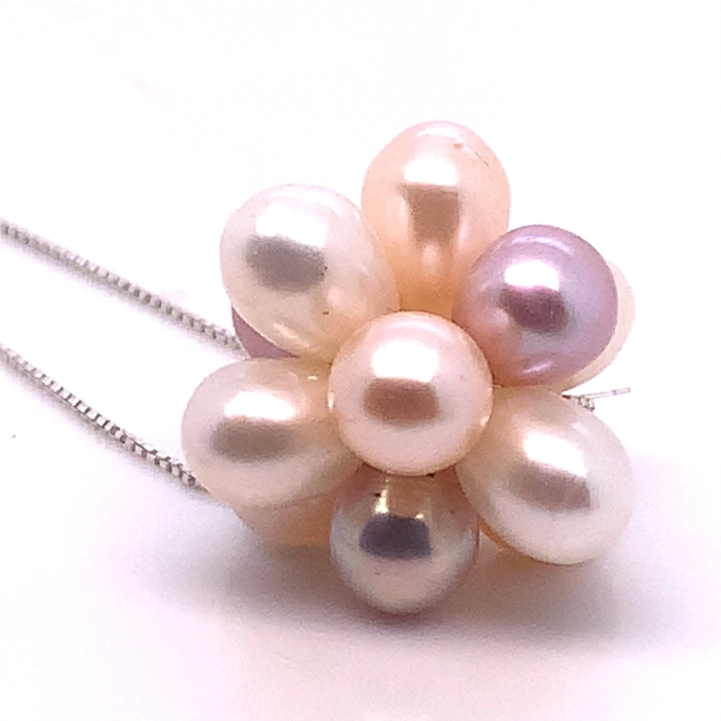 A necklace featuring a cluster of pearls. The pearls appear to be a mix of colors, with a Sterling silver chain. You will love wearing this necklace to feel calm and elegant.