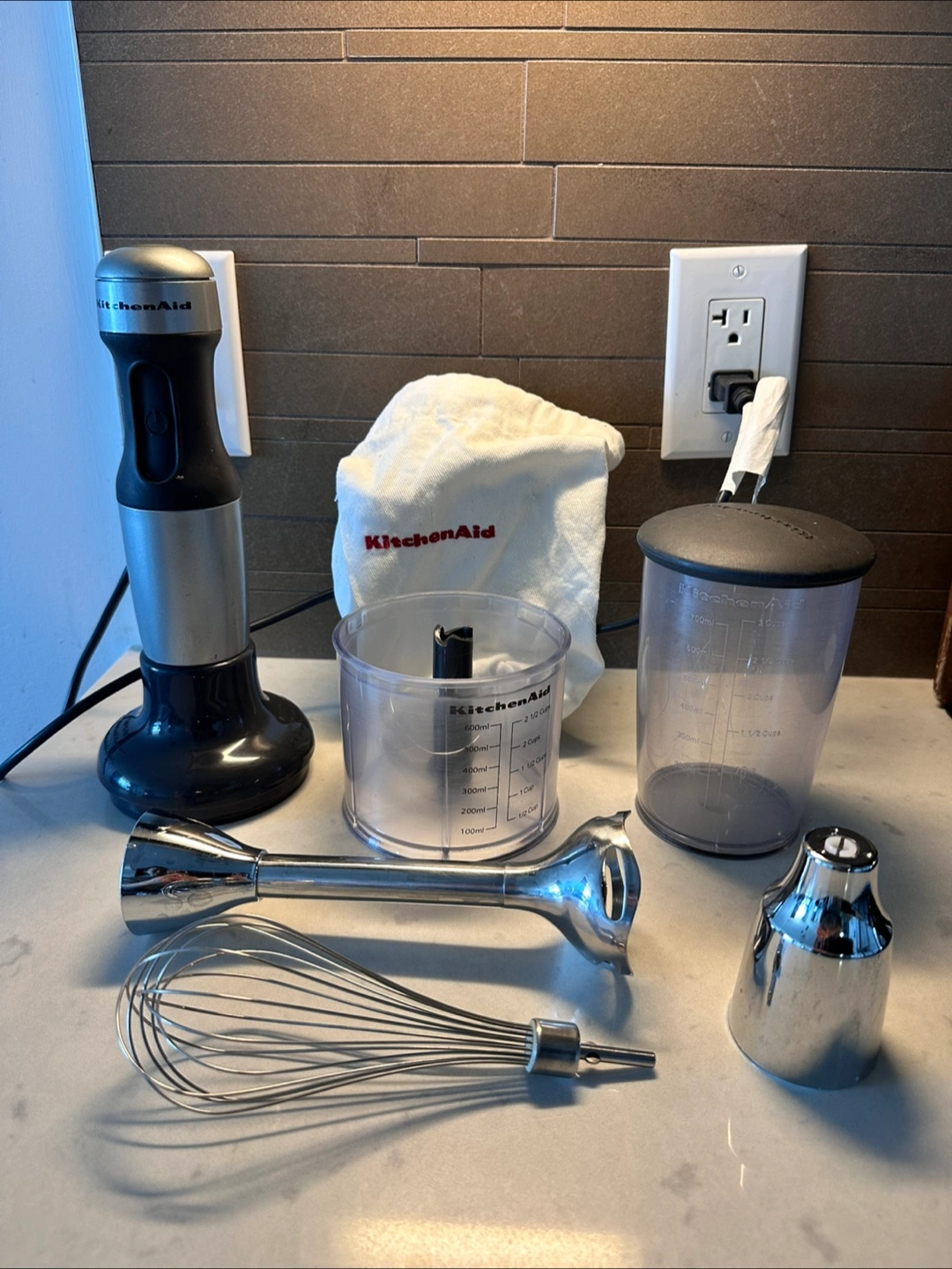 A KitchenAid hand blender set. Comes with multiple attachments and a storage bag. A great addition to any kitchen, perfect for creating your favourite soups.