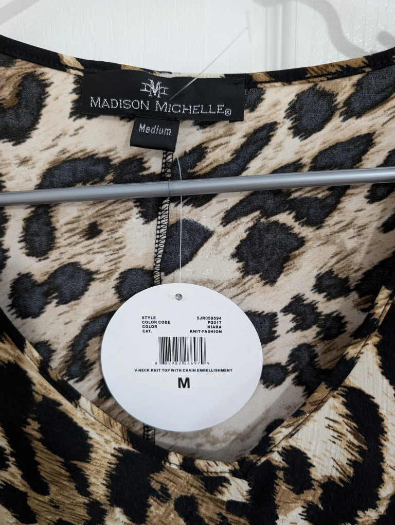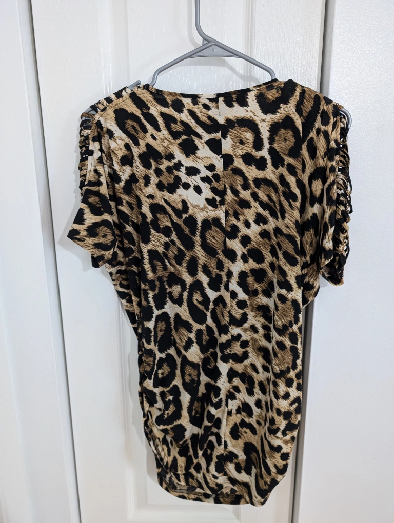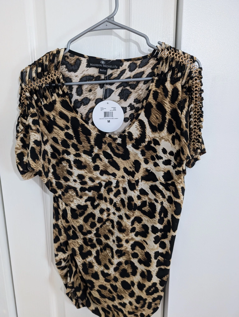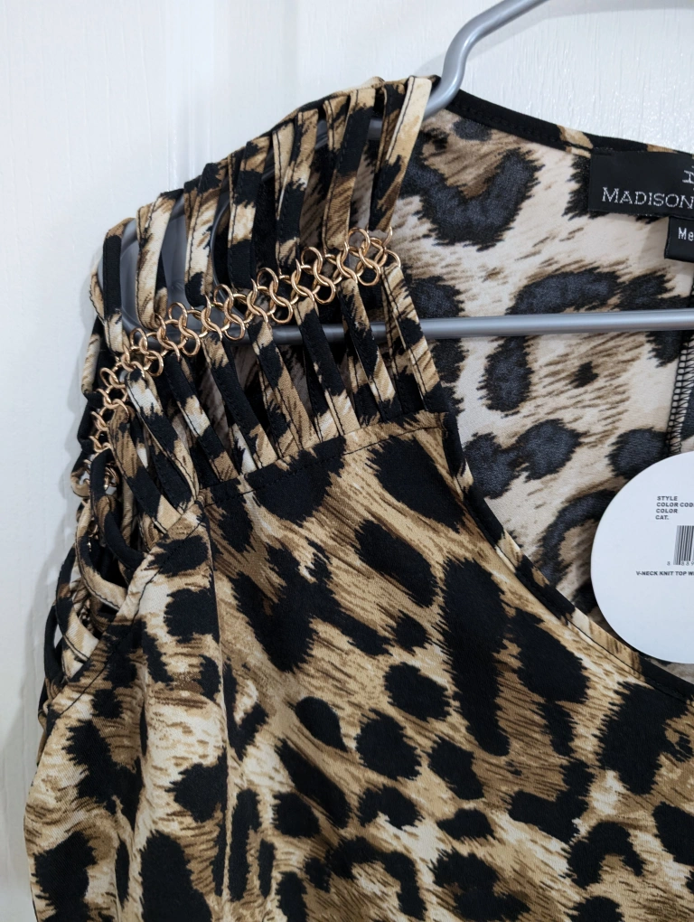 213A leopard print top with a V-neck. Features decorative chain embellishments on the shoulders. A great outfit for any outing, or to relax in at home.