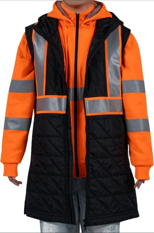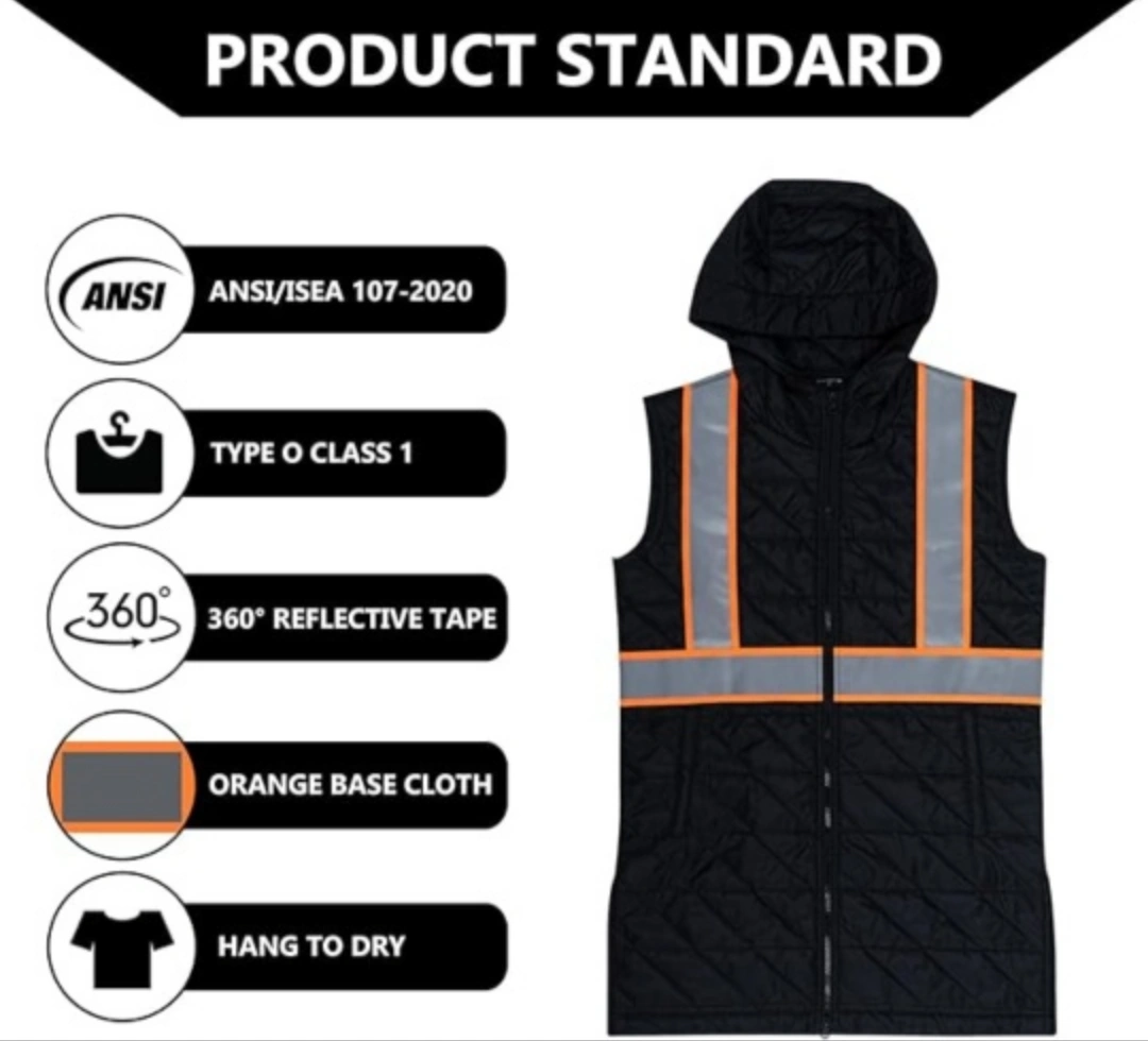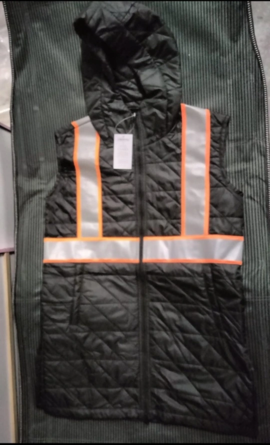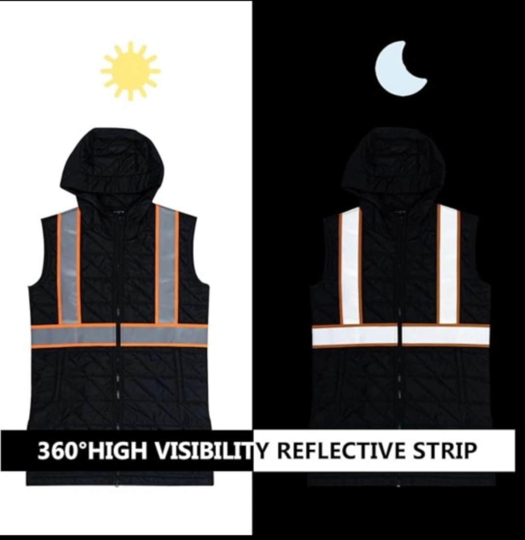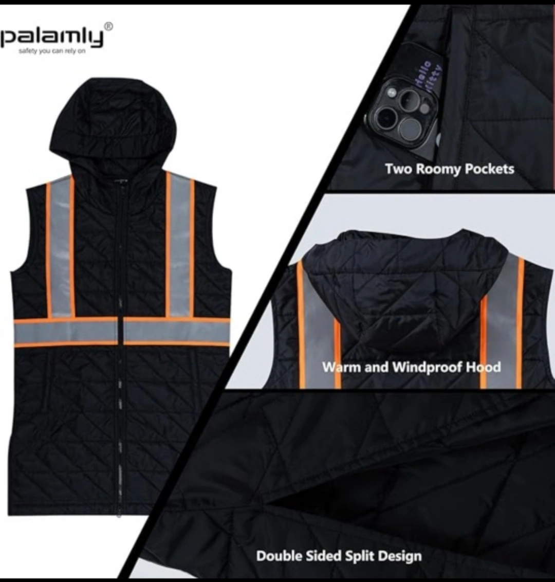 Features a hood and two pockets. Quilted design, double-sided split. Offers high visibility. Putting this on helps ensure visibility, keeping you at ease.