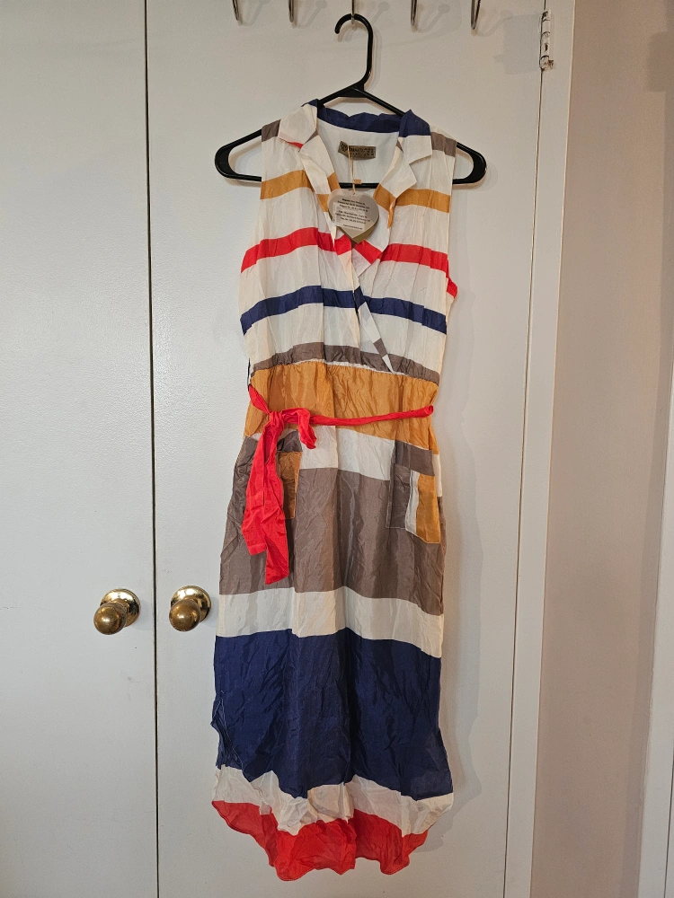 A colorful, sleeveless dress. Features striped pattern with a red belt. Perfect for a relaxing day out. The dress is lightweight and airy.