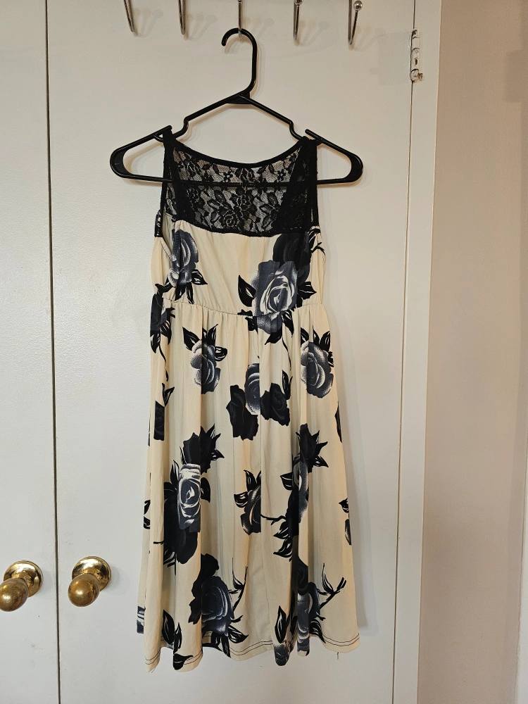 A charming dress with a cream background and black floral print. The dress has a lovely lace detail at the shoulders. A perfect dress for a summer picnic.