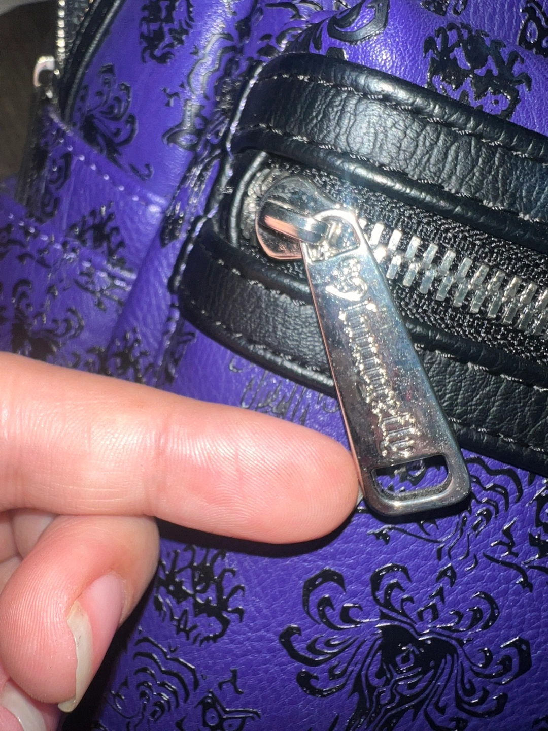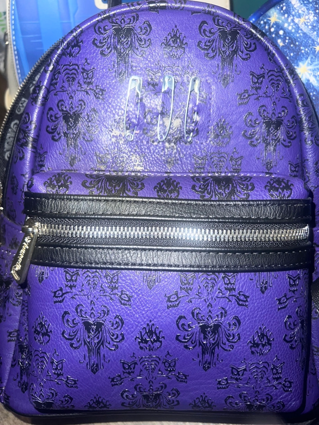 A purple backpack with a floral pattern. A zipper closure is visible. The interior shows a matching pattern. Pack this backpack to carry your things on a relaxing day out. Haunted mansion loungefly