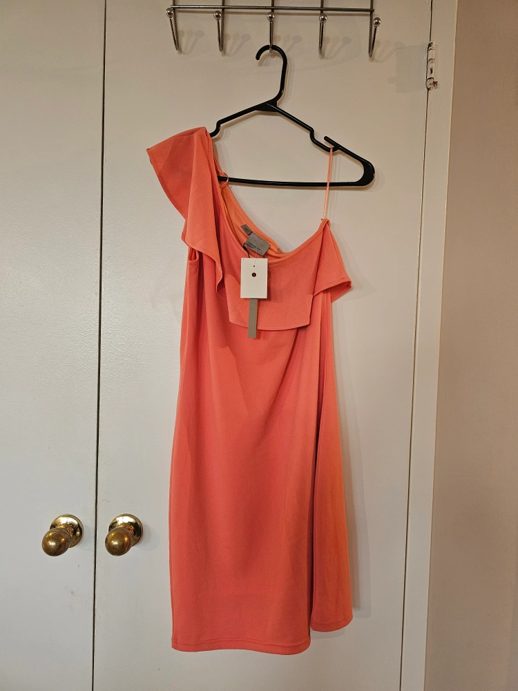 Pretty one-shoulder dress. The dress features ruffles. The dress is peach coloured. Perfect for enjoying a sunny day outside.