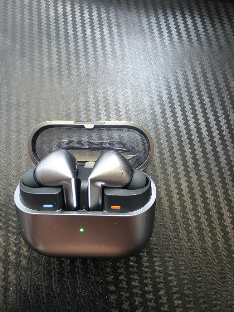 Samsung galaxy buds 3 pro Silver wireless earbuds. Includes a matching charging case with a transparent lid. The case has an indicator light. Use these to escape into your own world of music.