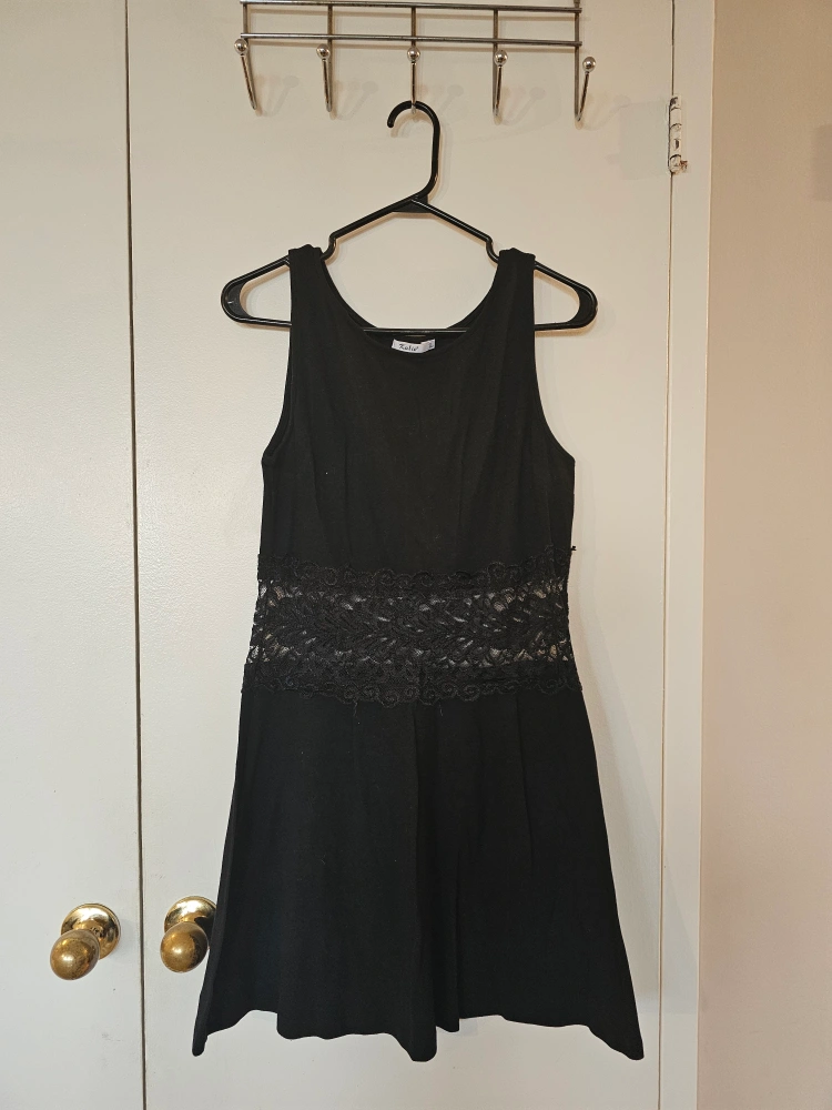 Black dress on a hanger. Sleeveless, with a lace design on the bodice. The hem is flared, creating a nice silhouette. This dress is great for date night, for feeling confident and calm.