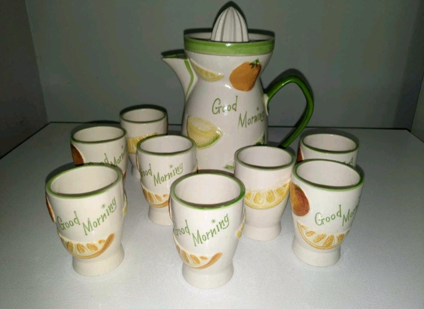 A ceramic juice pitcher with matching cups. Decorated with lemon and orange images. The pitcher includes a juicer and has a handle.