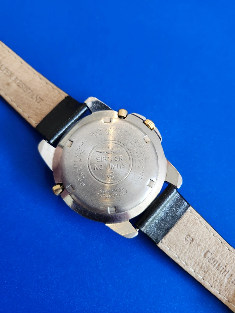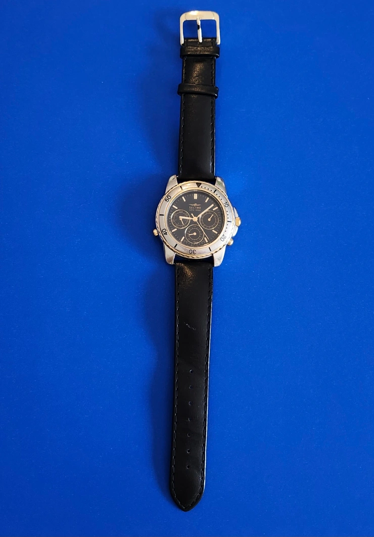 A sophisticated watch, with a black leather strap. A silver and gold-toned watch face. A great item to help keep track of time. Waterproof. Swiss made, stainless steel and quarts.