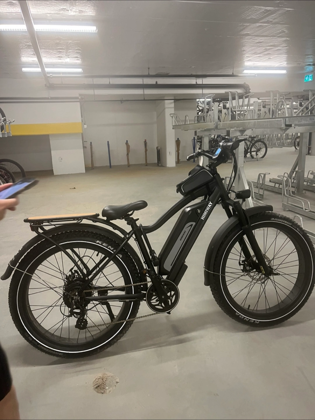 A striking black electric bike, with a comfortable seat. Features large tires and fenders. The rear has a wooden rack. An electric bike is the perfect mode of transportation to clear your mind on a peaceful ride.