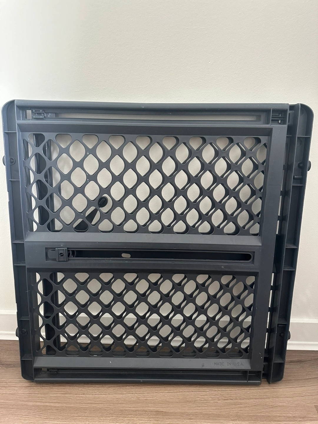 Dark grey gate with a diamond-shaped pattern. Made of plastic. Features a locking mechanism. A perfect item to keep your little ones safe. I have a bunch of baby items that are in good condition, just take everything for $30 Baby lounger Play mat/ mobile entertainment centre Bottle warmer Bottle sterilizer Grass drying pad Adjustable pressure mount baby gate