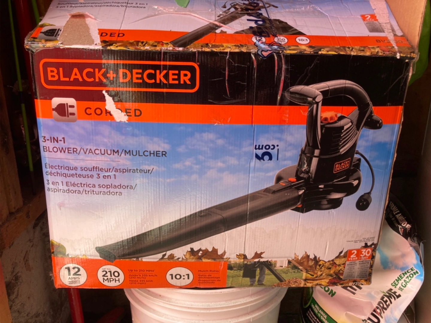 A corded 3-in-1 blower, vacuum and mulcher. It is in its original packaging. This is a great way to make yard work simpler.