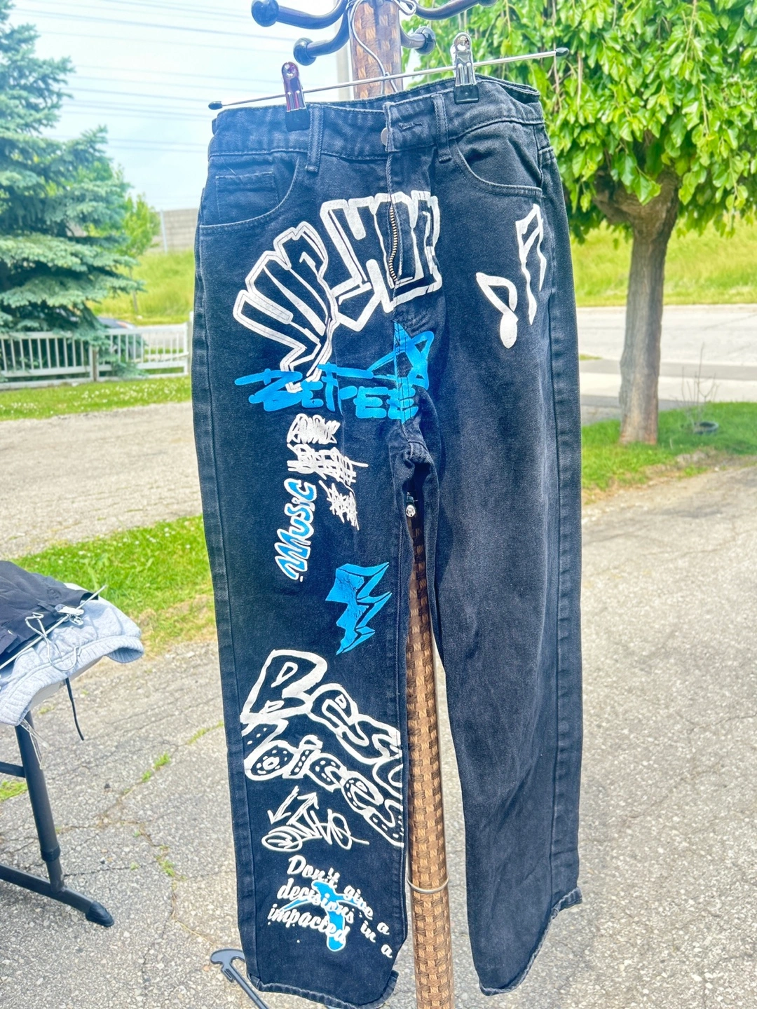 196Black denim jeans. Covered in various graphic art. Great for making a statement while you are out and about.