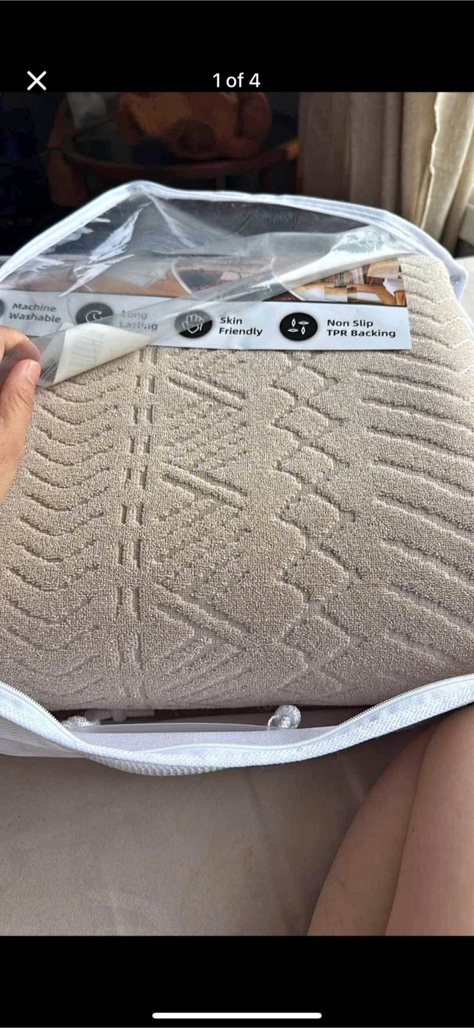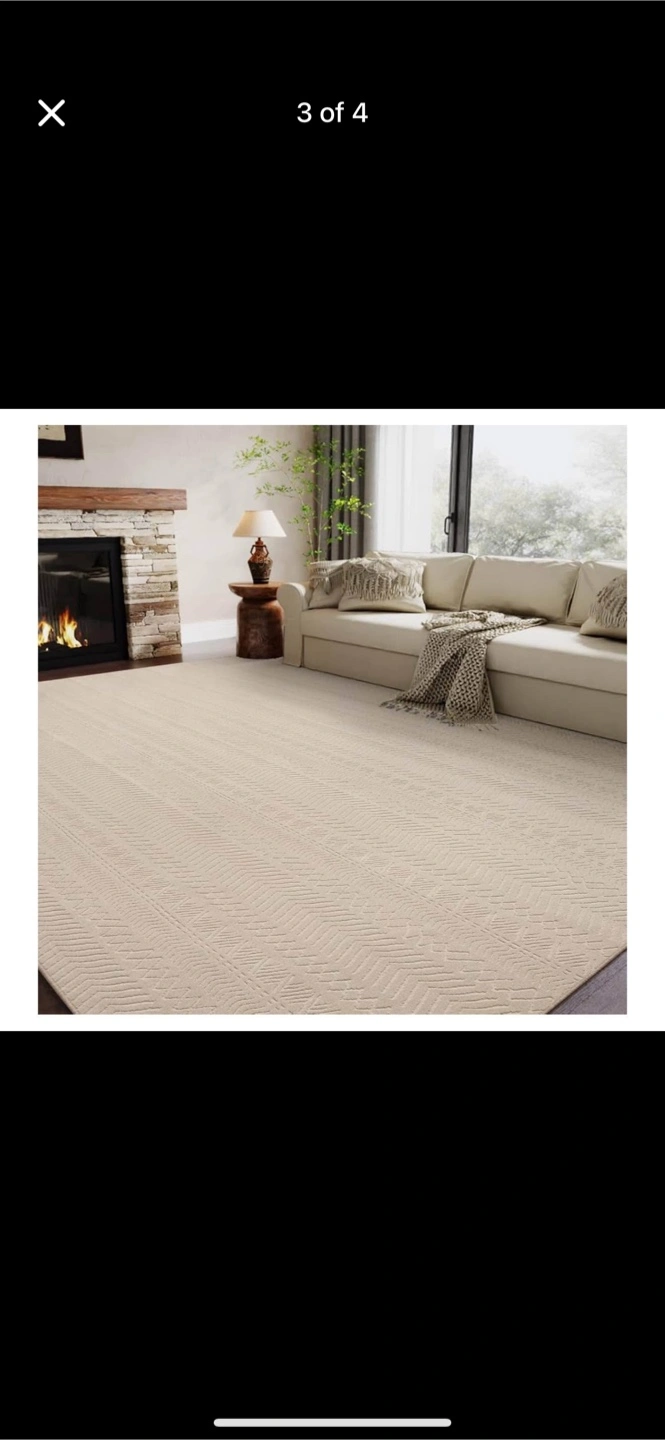 Beige-coloured area rug with textured patterns. Rectangular shaped. Soft colour, good for any decor. Imagine resting your feet on this rug after a long day.