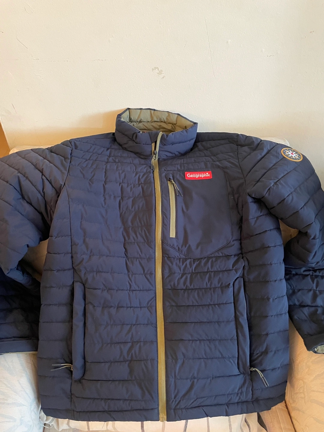 Padded jacket. Features a zip-up closure. Dark blue colour with horizontal stitching. The inner lining is khaki. This jacket is great for any chilly day, making you feel cozy and warm.