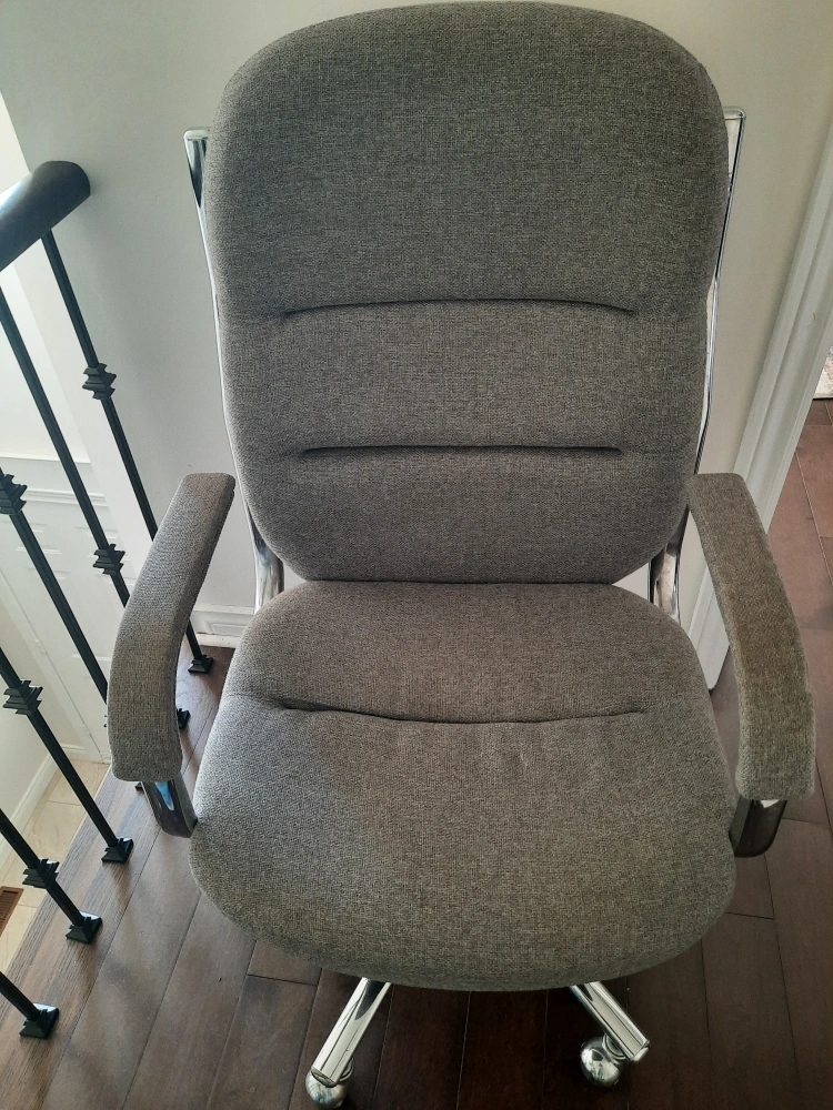 A comfy office chair with a padded backrest and armrests. Features a chrome base with wheels, and adjustable height. Perfect for long days of work, you can enjoy it in the comfort of your home.