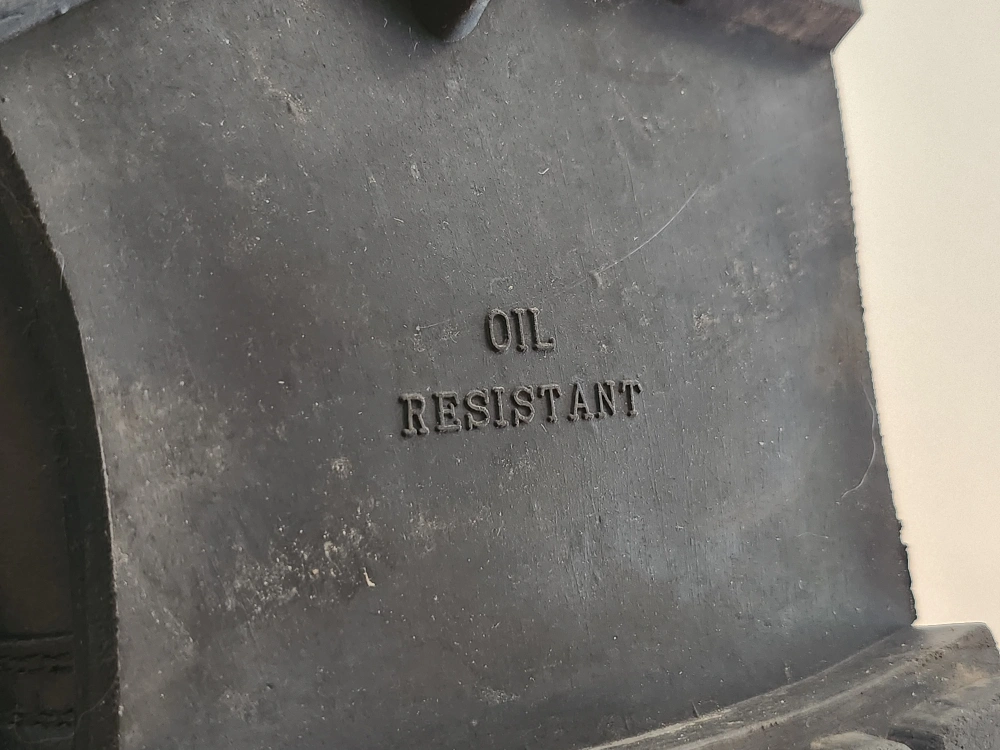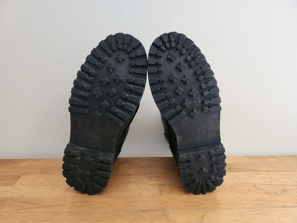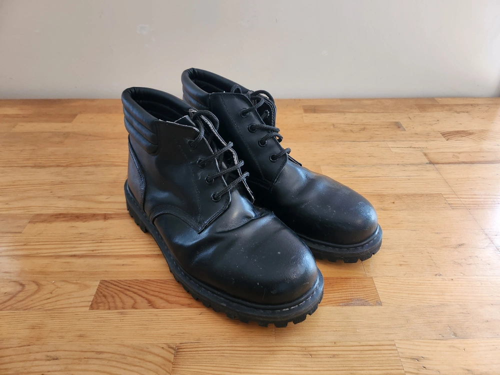 These black work boots are a classic style. They feature a lace-up design. The soles have a treaded pattern. Oil resistant.