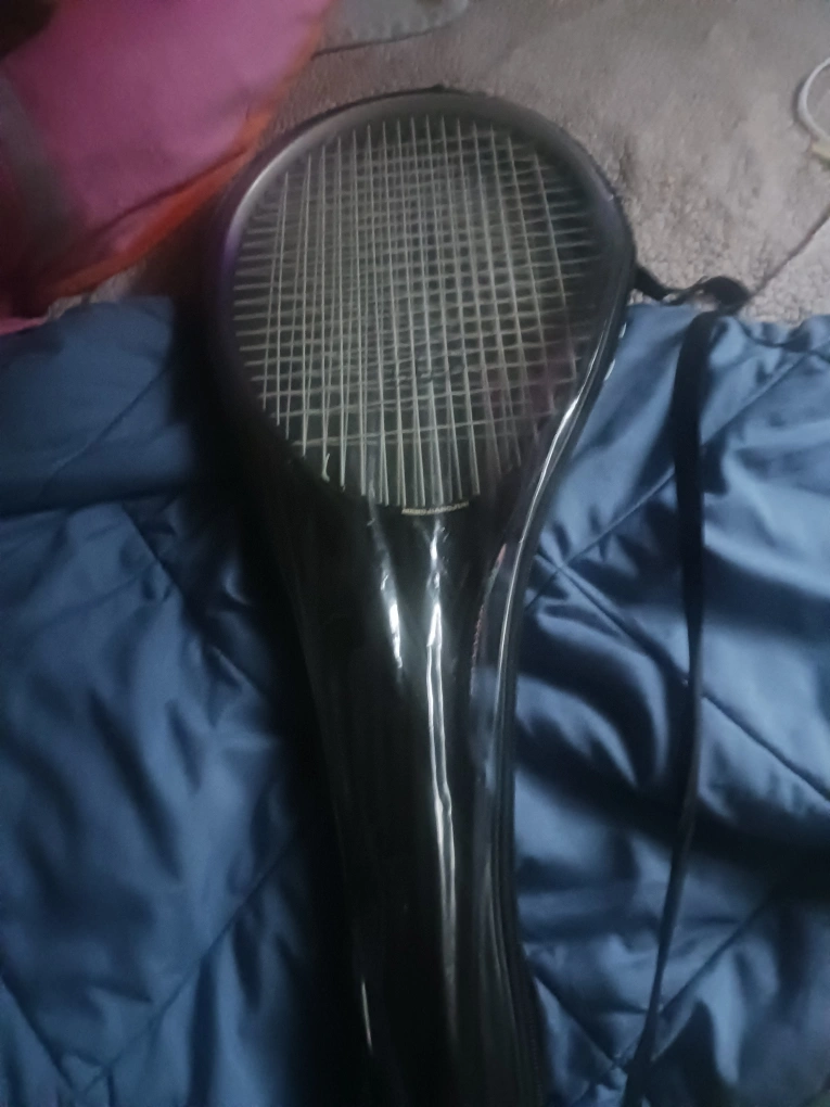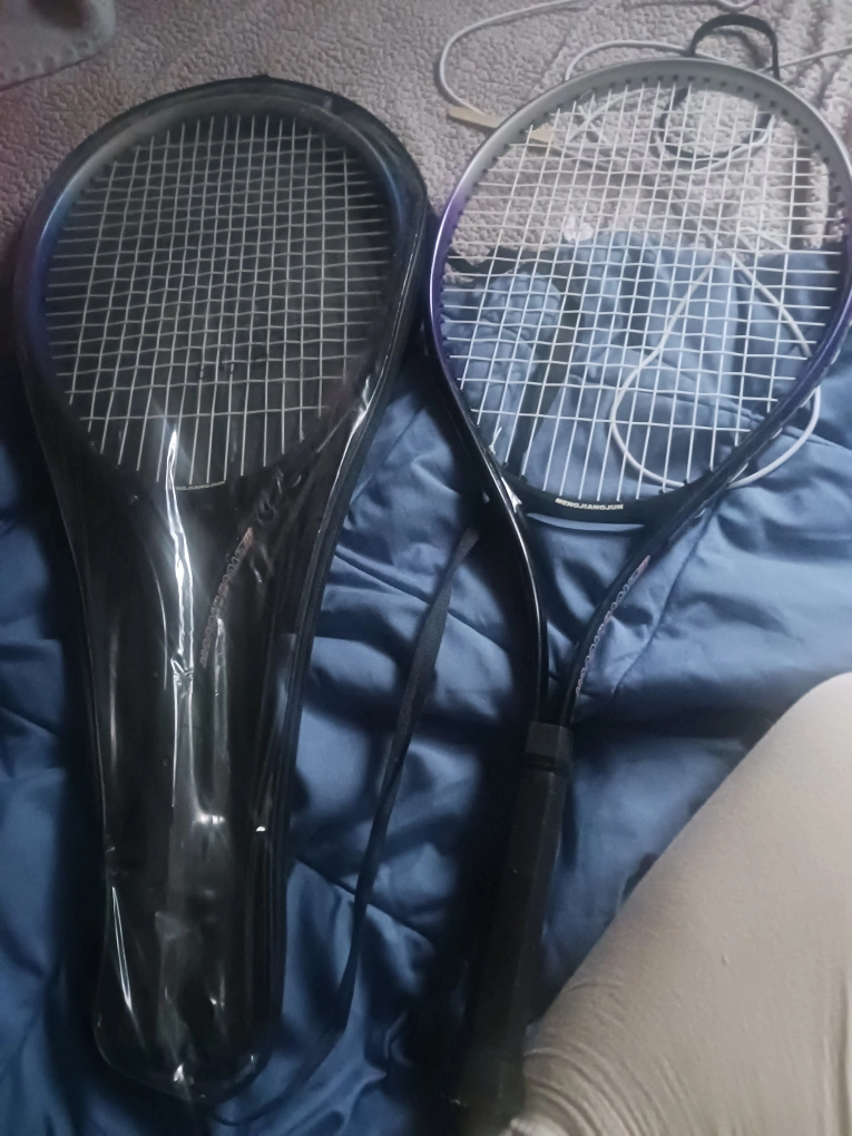 33Black tennis racket with a purple and white string design. Includes a case to protect it. Taking this out to play is a great way to relieve stress. two tennis racket one blue and one purple