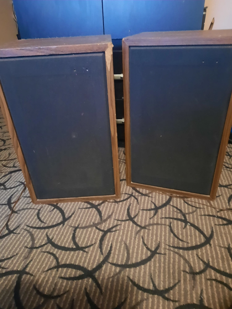 Pair of speakers with wooden frames. Dark fabric covering the speakers. They will definitely add some good vibes to your listening experience.