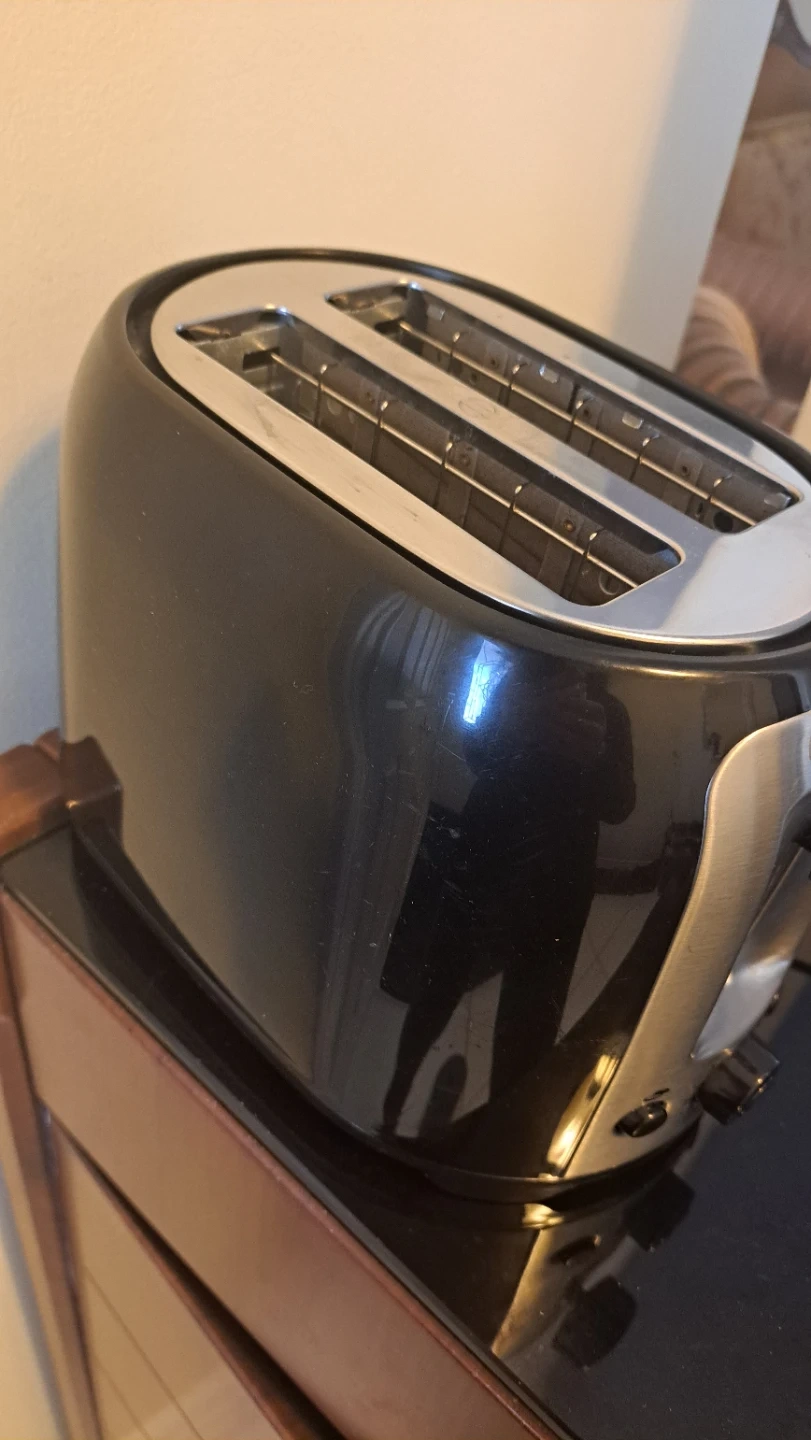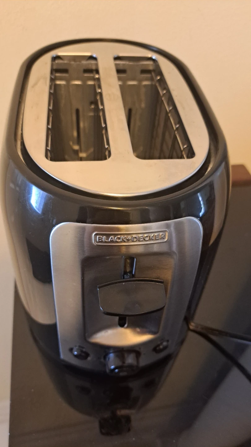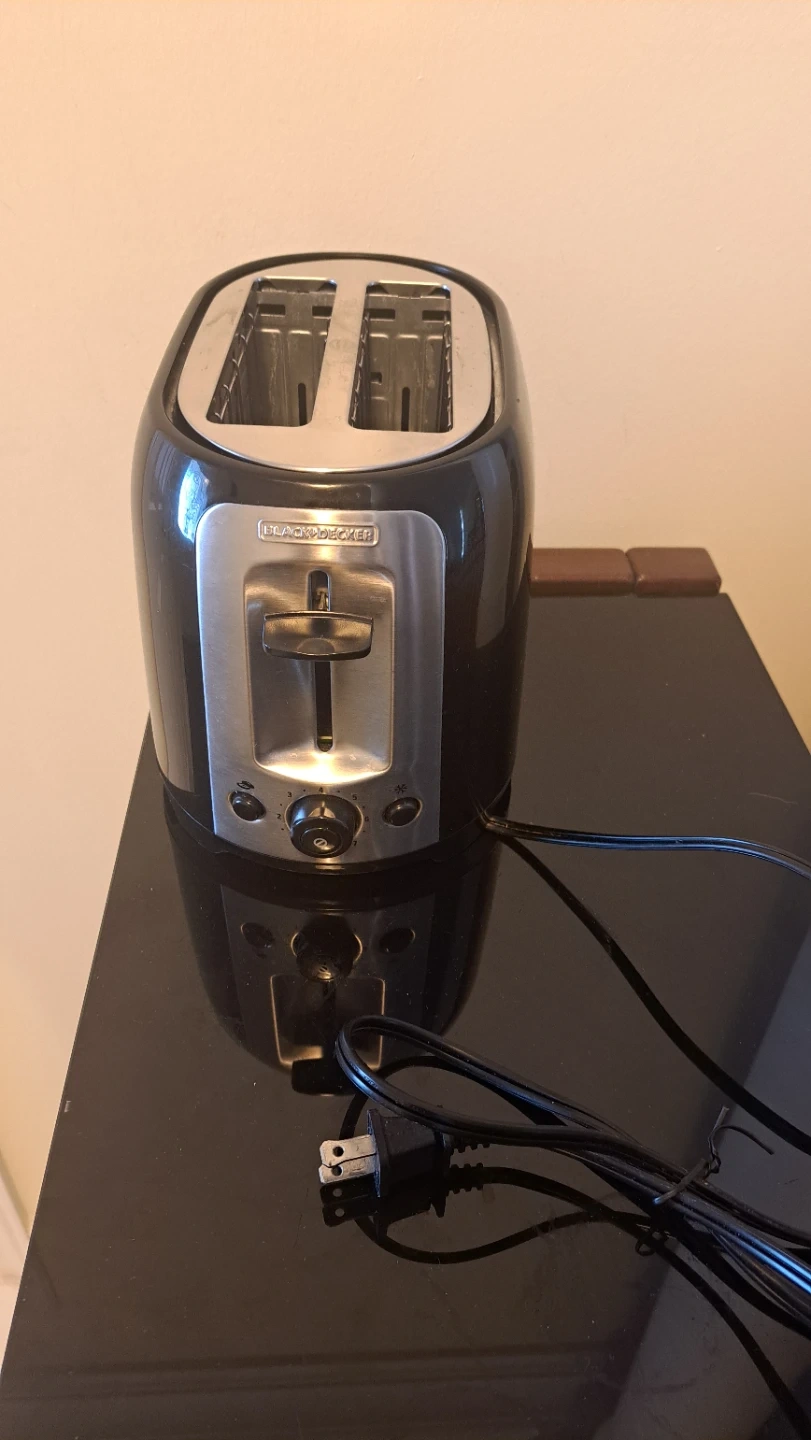 This is a Black & Decker 2-slice toaster in black. It has a stainless steel accent. The toaster features a lever for lowering bread and a dial for browning control. It's ready for your morning toast!
