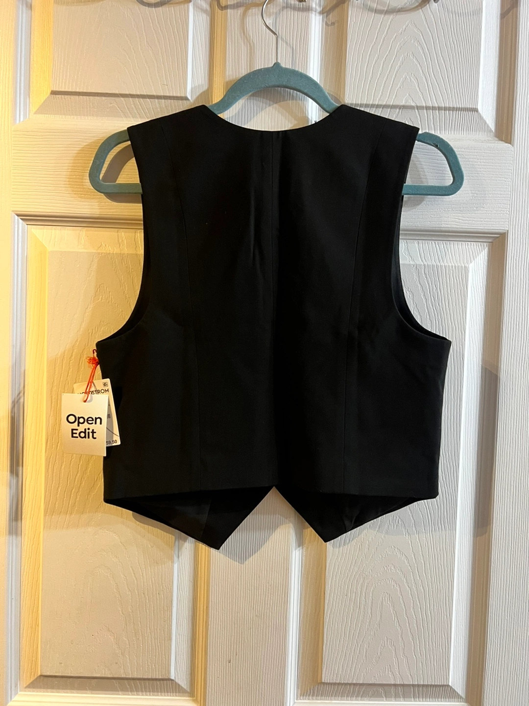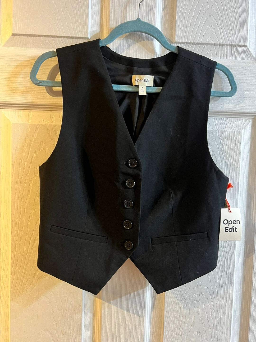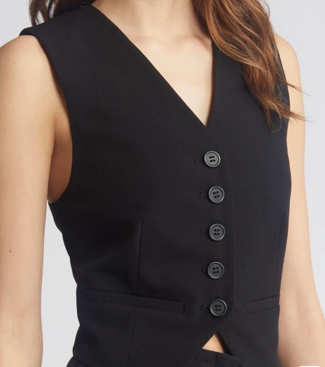 96A versatile black vest, perfect for layering. Features button closures and two front pockets. Made in Indonesia. Great for wearing over a simple blouse.