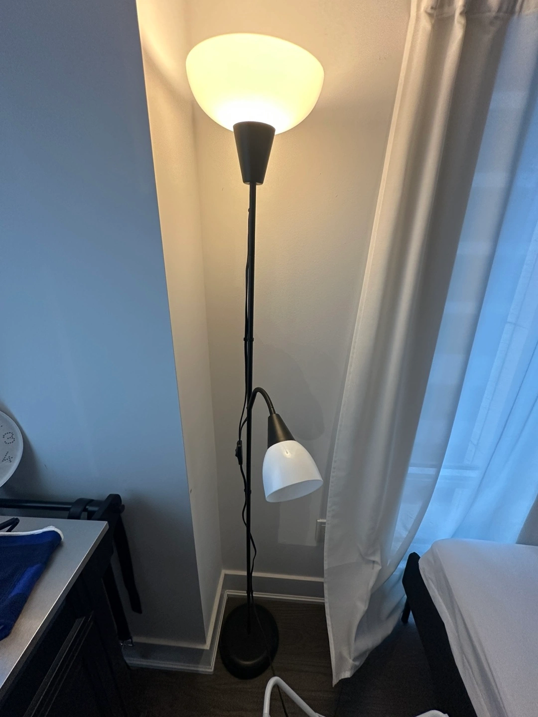 40A black floor lamp. Featuring a large, white lampshade. Includes a smaller reading light as well. I hope you enjoy the soft light in your space for those moments you are trying to unwind.