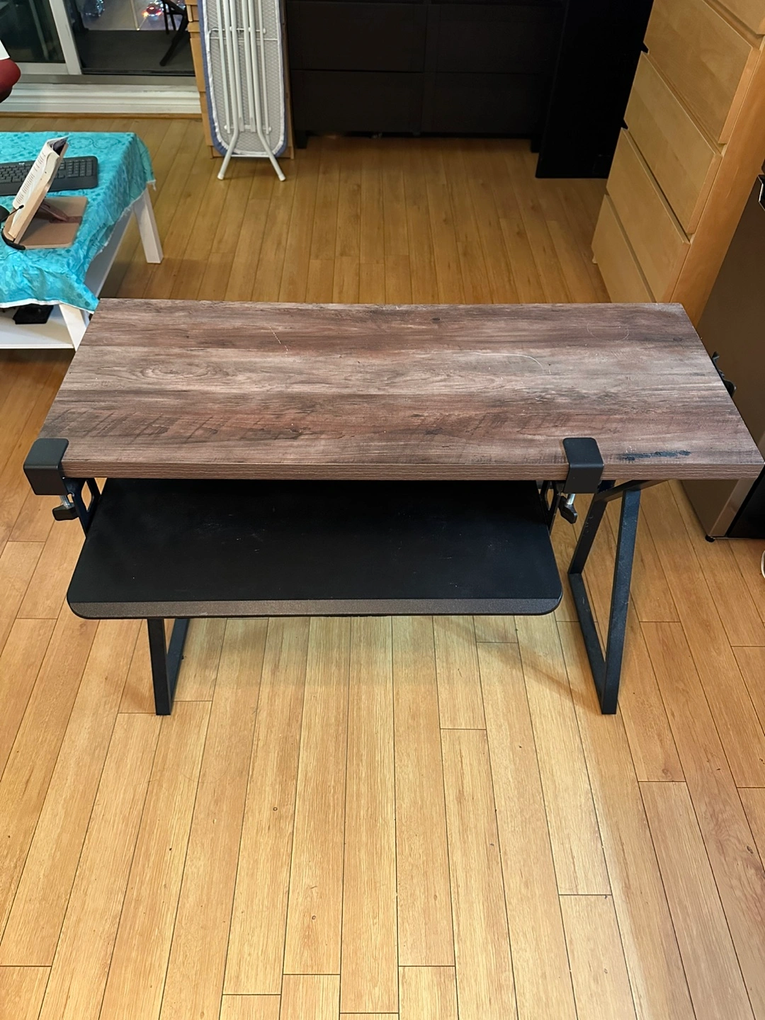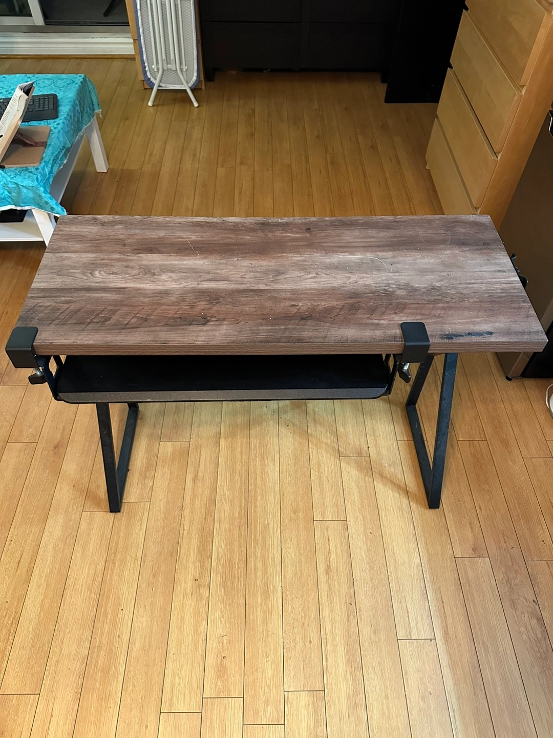 It has a wooden table top. Features a black pull out tray underneath. Black metal legs. Perfect for a relaxing time writing or working at home.