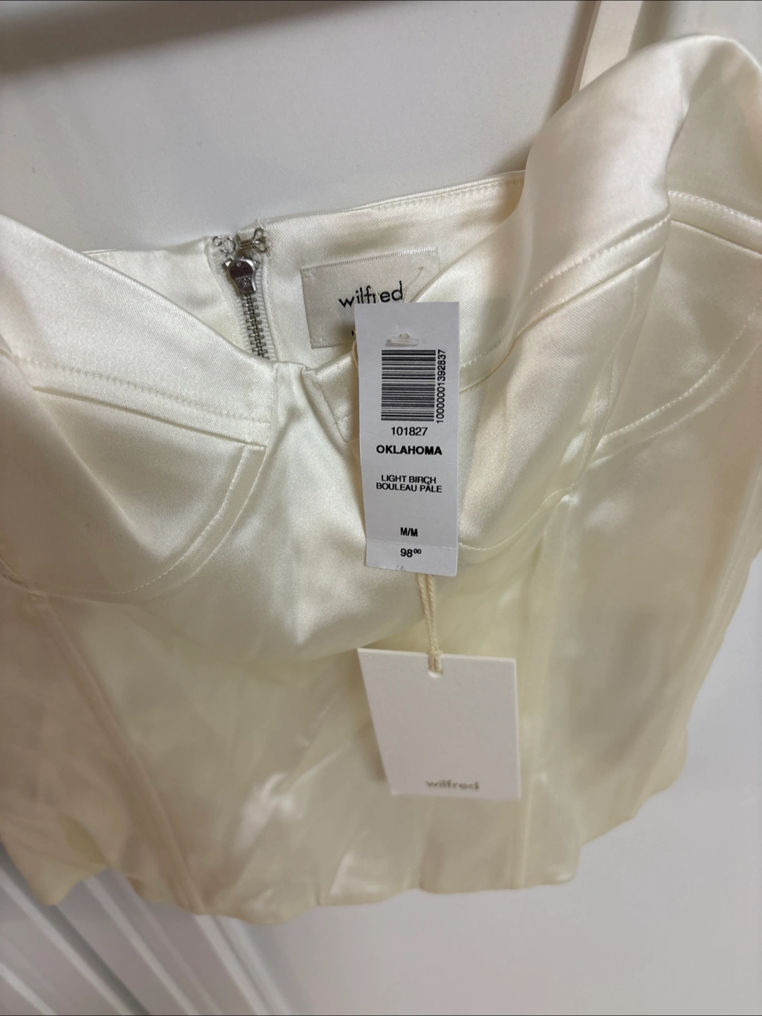 Off-white corset top. Silky material. Features a zipper closure and adjustable straps. Perfect for date night. The simplicity of this top can help you feel at ease.