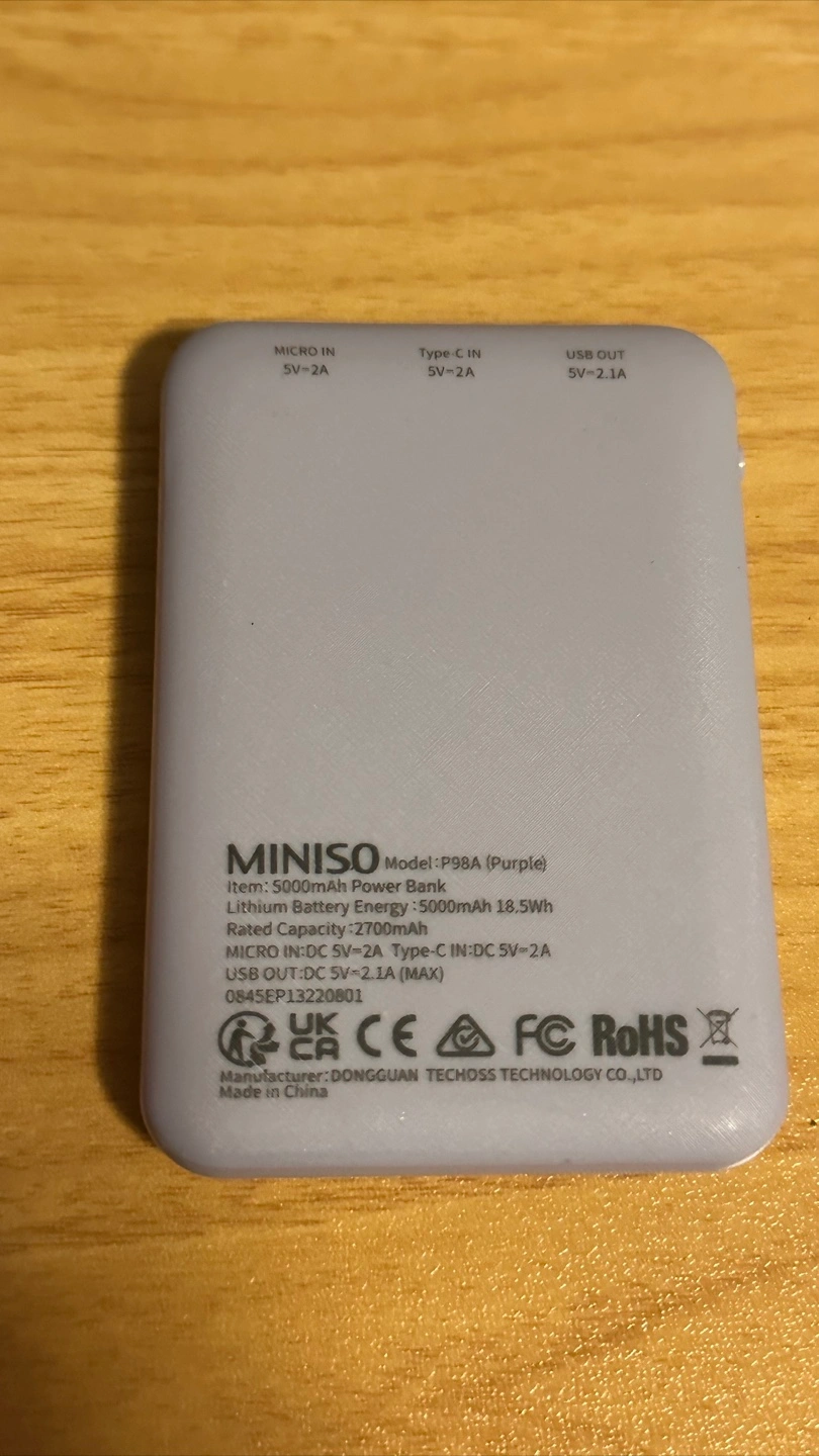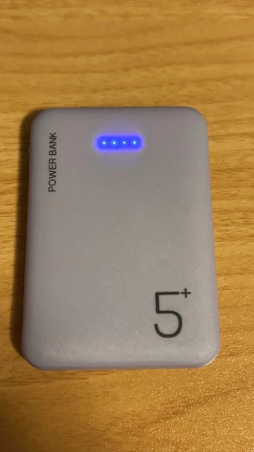 687A power bank in a soft, light purple colour. Features 4 small blue indicator lights. Marked with 'Power Bank' along the top, and a plus sign with the number 5 at the bottom. This is perfect for those times when you need to charge your phone and relax. - Pickup near parliament and ontario