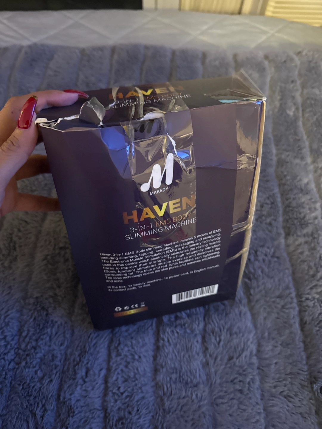 A 3-in-1 body slimming machine. Box packaging includes a beauty machine, power cord, and manual. Comes with several features. The box also mentions it removes fat, tightens skin, and relieves fatigue. This device may be just what you need to feel your best at the end of a long day.