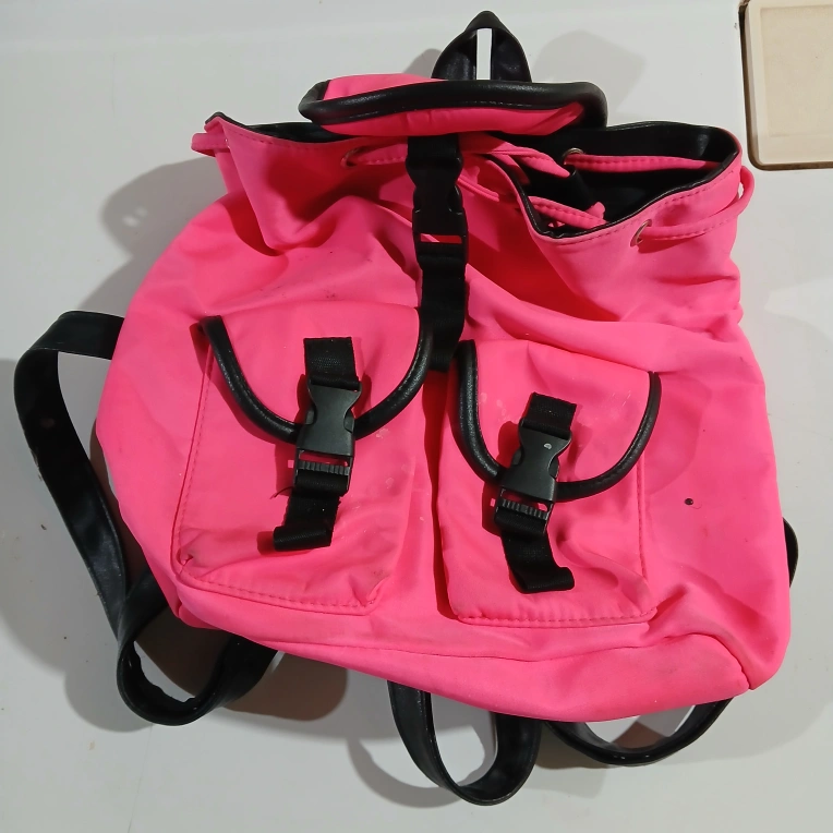 A bright pink backpack. Features black straps and buckles. Includes two front pockets. This backpack will be perfect for taking on a peaceful walk.