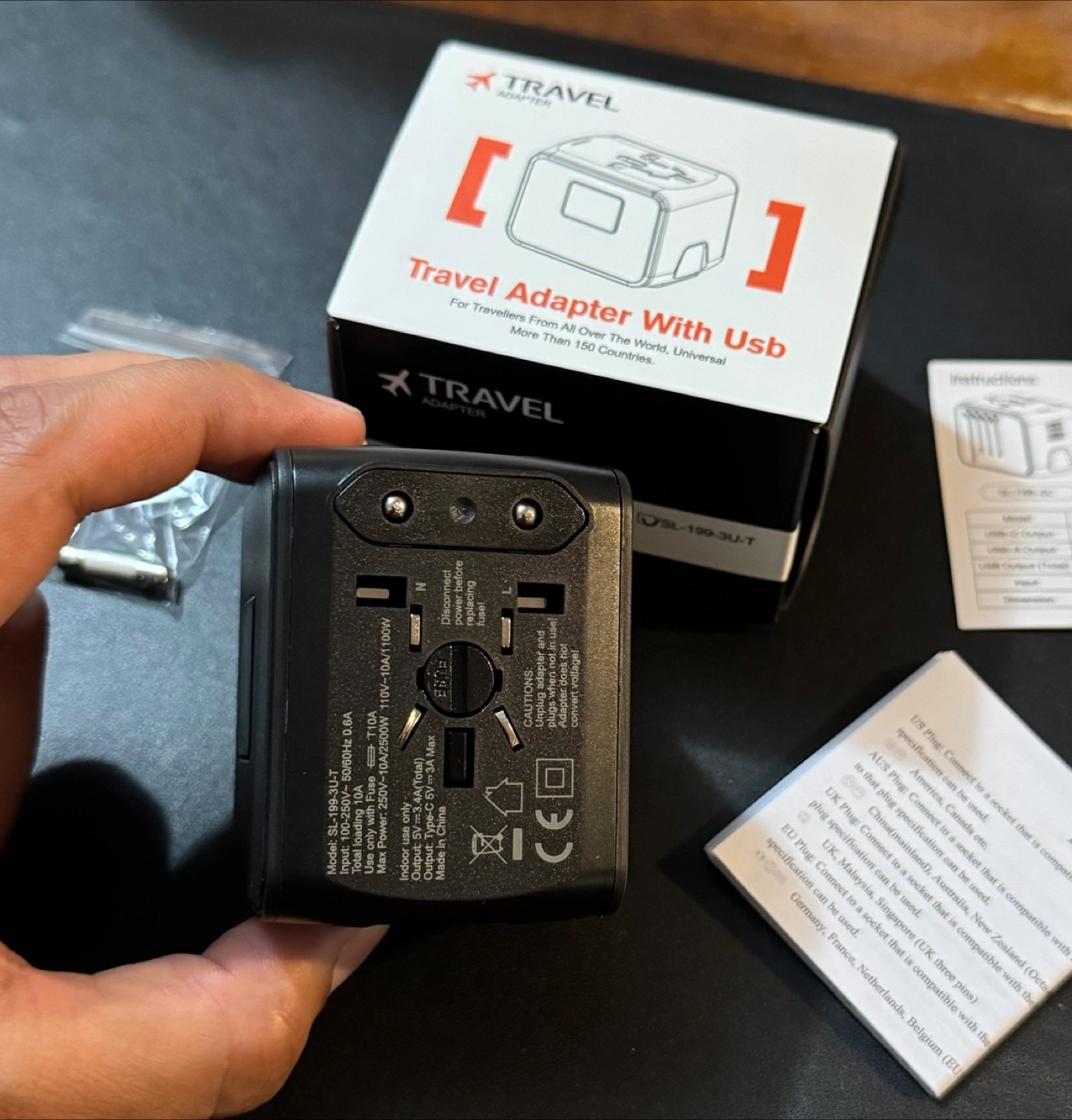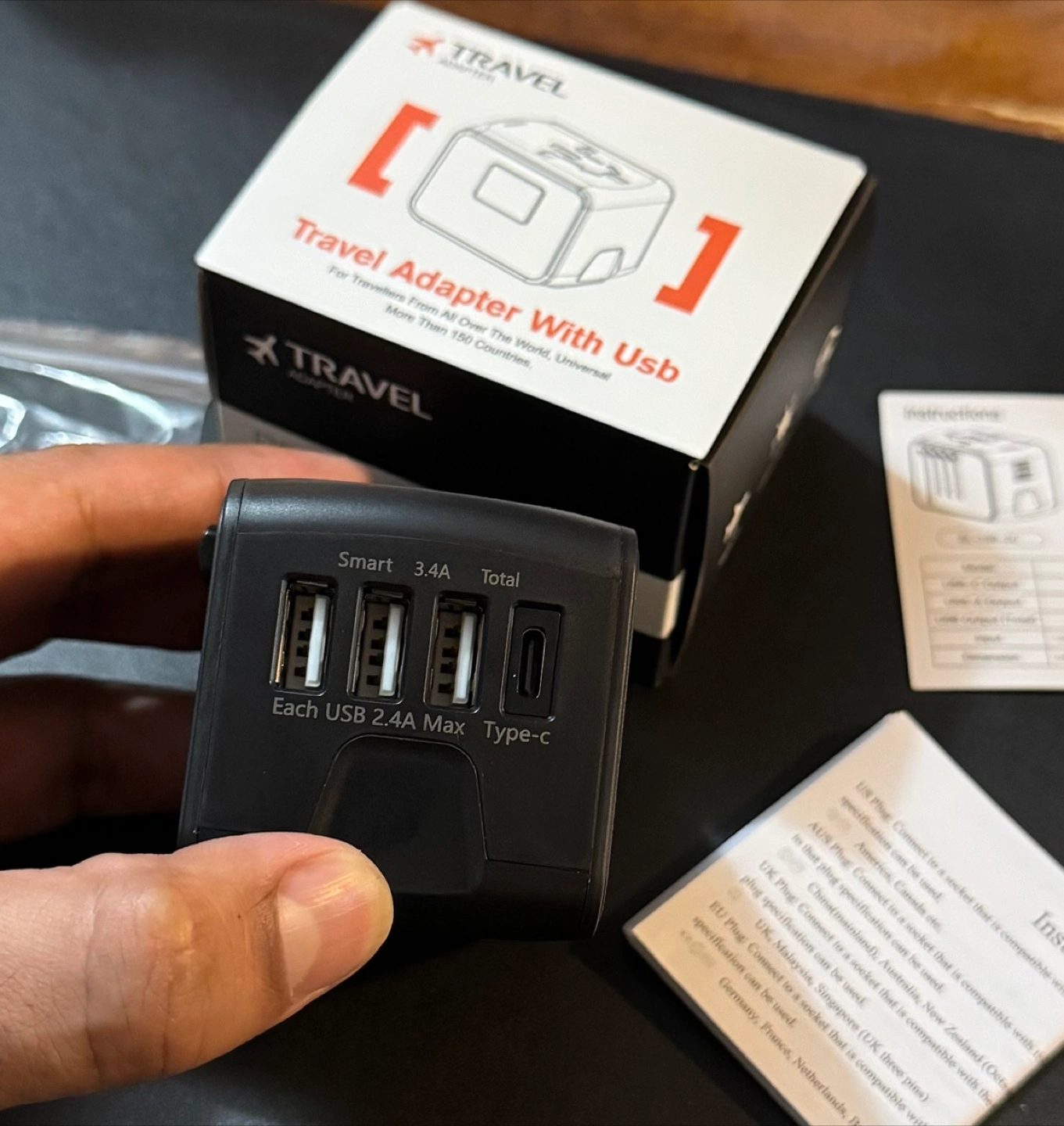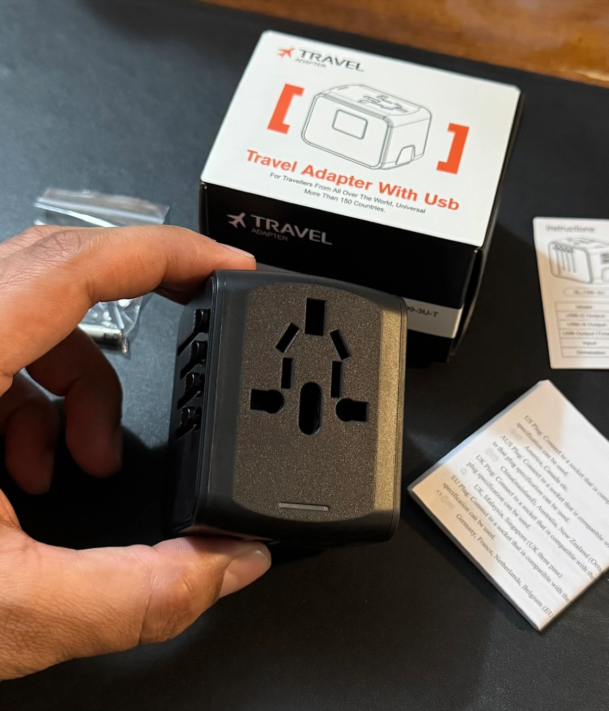 Universal travel adapter with USB ports. Comes with its original packaging. Perfect for your next trip so you can have peace of mind knowing you'll be able to charge all your devices.