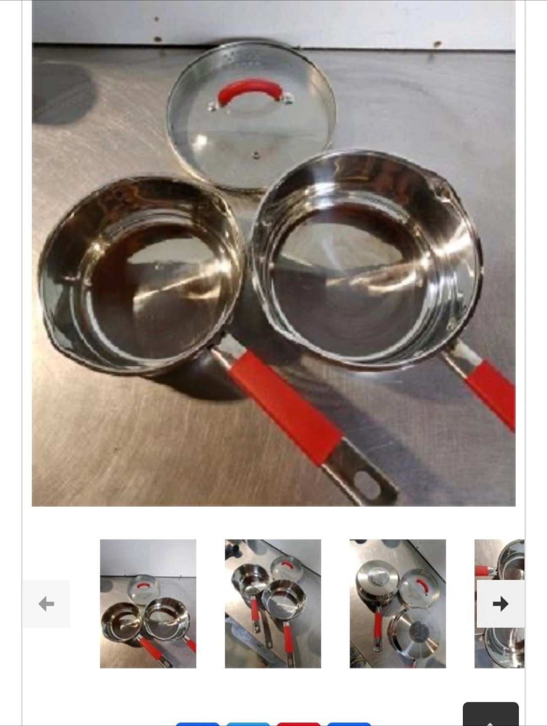 Two sauce pans and a lid. Stainless steel material with red handles. Great for making your favourite sauces.