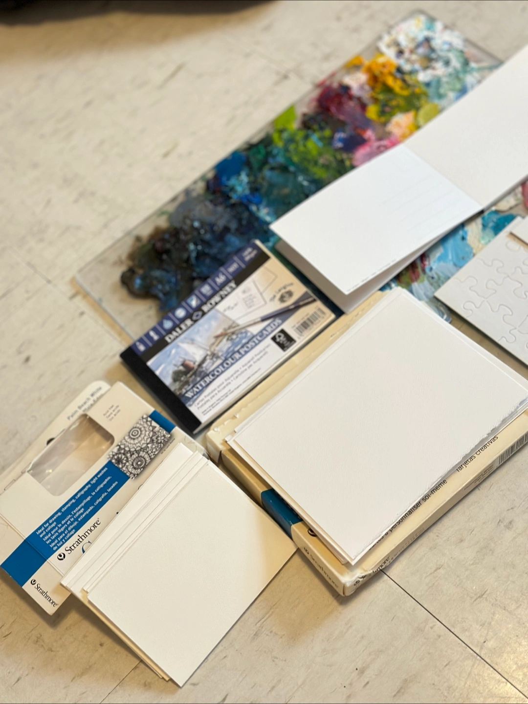 687*11 large postcards *7 small postcards (all come with an envelope) * 2 sets small size watercolour paper postcards (really great quality paper) the sets are still complete, I only used 2 papers out of the 2 sets. really good for drawing your own postcard and for gifting purposes:) * 2 jigsaw puzzles for creating ur own puzzle pieces. - total value is about $50 selling for $15 because I’m moving out:’) *free/bonus acrylic palette:)🎨 Pick up near parliament and Ontario