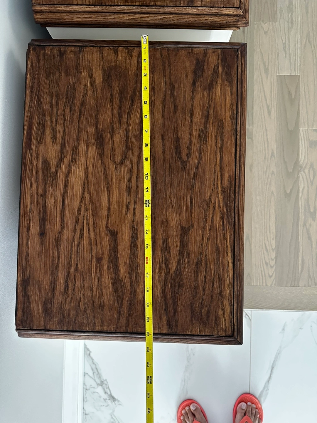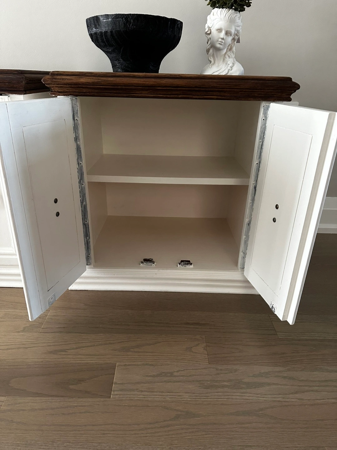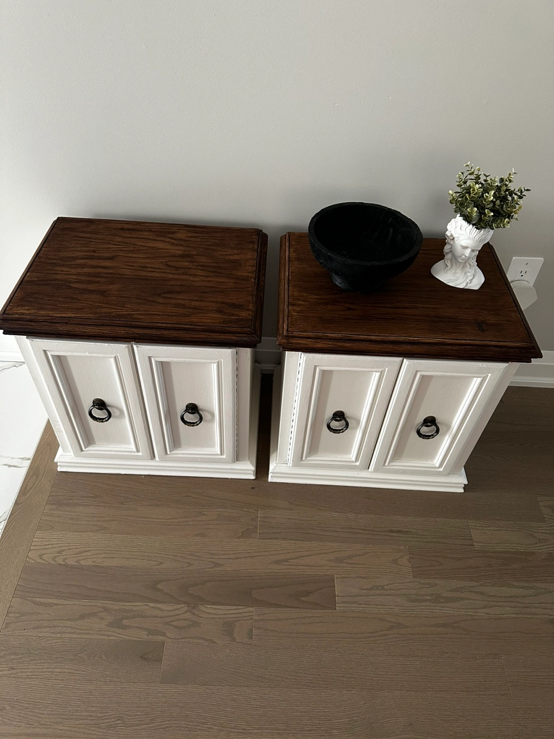I'm selling a set of two night stands. They feature a brown wooden top and white cabinets with a two-door design. The doors have ring-style pulls. A great place to have all of your essential items.