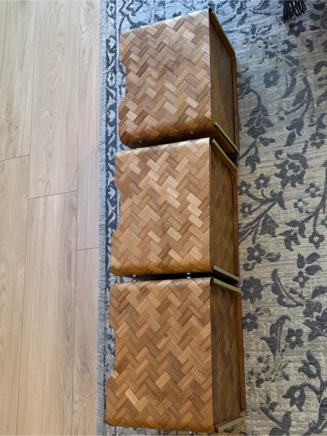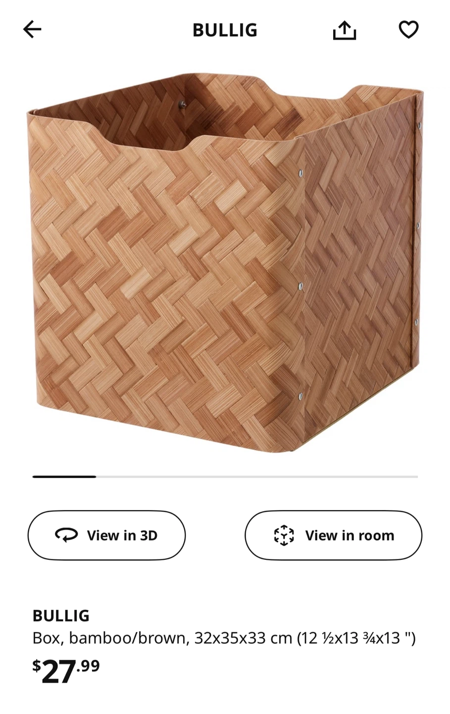 Selling a set of three IKEA BULLIG boxes. They are bamboo/brown and measure 32x35x33 cm (12 ½x13 ¾x13 "). Perfect for storage and organization!