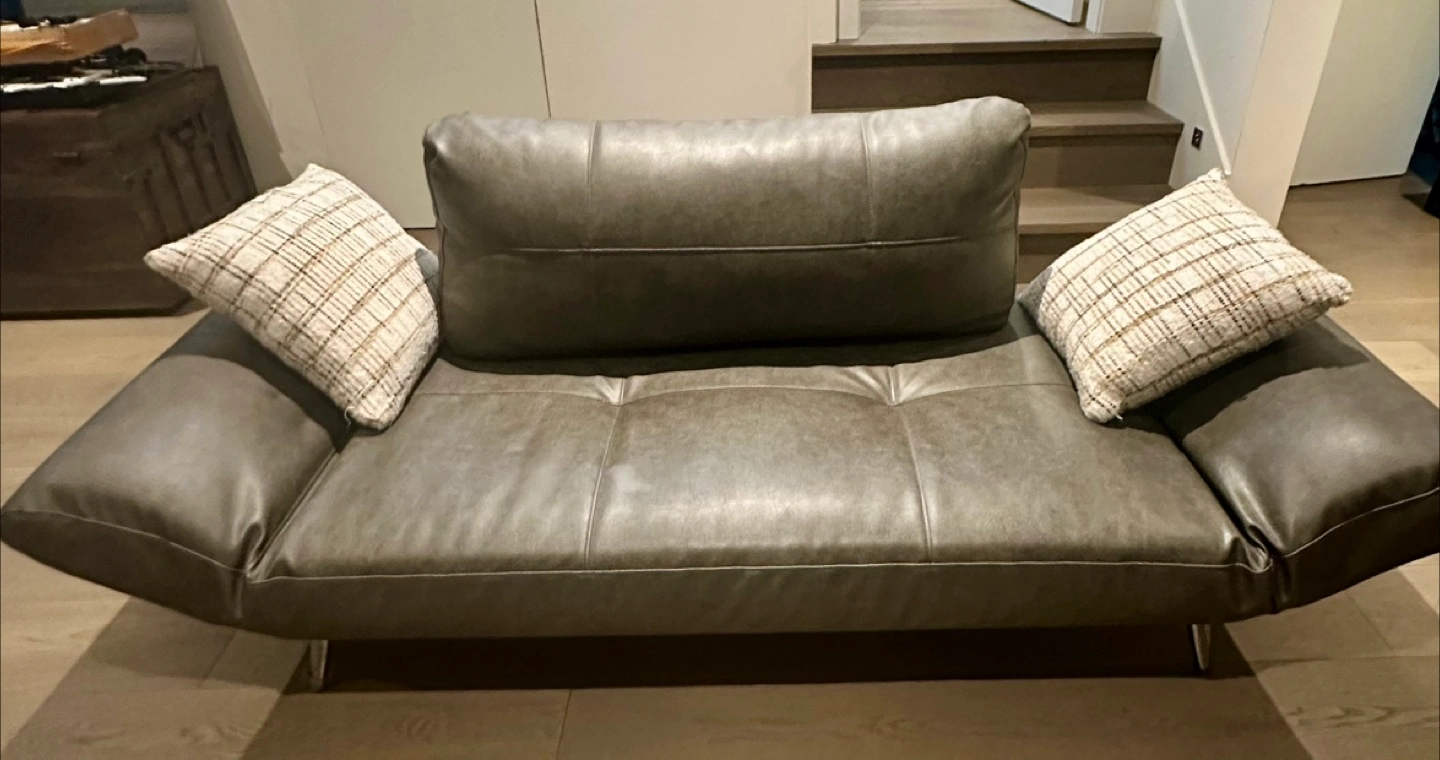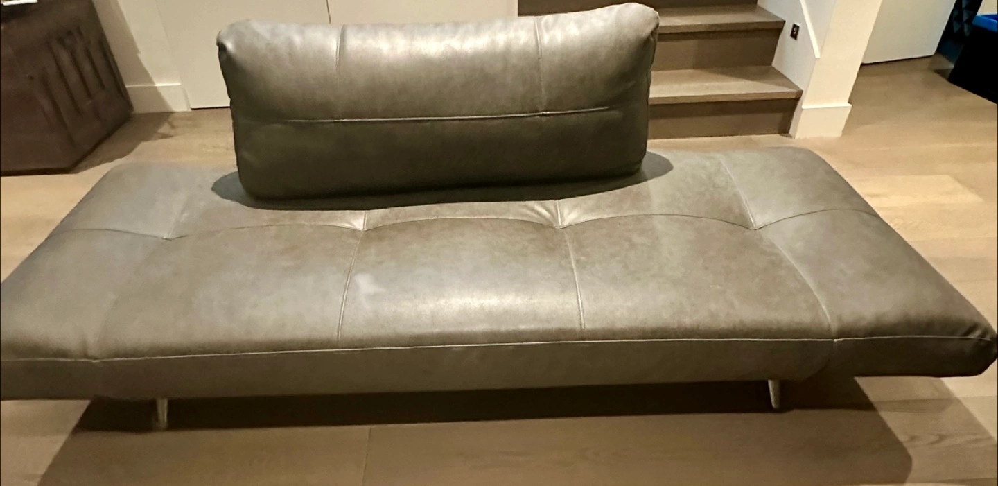 174A grey daybed sofa, perfect for relaxing. Has a button-tufted design on the seat. Features a backrest pillow. The cushions are supported by silver legs. You could enjoy a great afternoon nap on this daybed. The wings lift or fully lay flat Dimension are 75 inches length x 28 depth x 13 high when the sides are fully flat. The length goes to 68 when fully lifted.